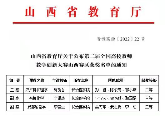 近日,山西省教育厅公布了第二届全国高校教师教学创新大赛山西赛区获奖名单,我校荣获优秀组织奖,选派的3个参赛团队均取得佳绩,其中陈爱香团队荣获正高组二等奖,李银涛团队和李建忠团队荣获副高组三等奖。