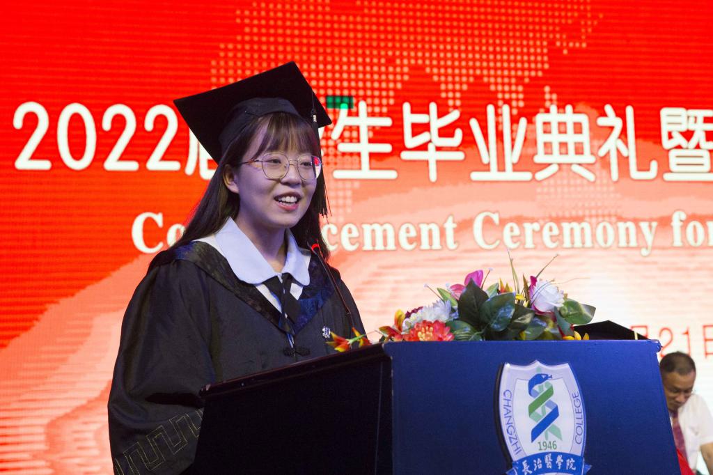 硕士研究生代表、研1901班李远同学,本科毕业生代表、第一临床学院临床1713班王思怡同学先后发言,表达了对母校、对老师们的感恩和对同学分别的不舍,分享了自己的心路历程、大学生活感悟和对“长医精神”“长医校训”及医学生誓言的深刻理解,号召同学们争做有理想、有情怀、有本领、有担当、接地气的医者,投身医疗卫生事业,为增进人民健康福祉作出贡献。