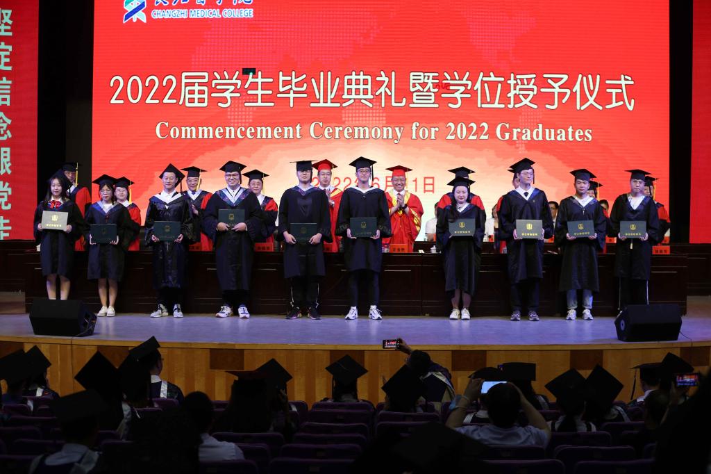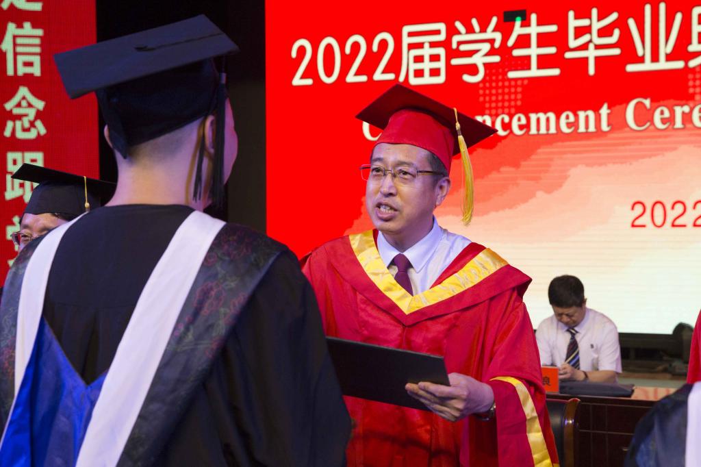 校领导为毕业生代表颁发毕业证书,为2022届优秀毕业论文获得者和优秀毕业论文指导教师代表颁发荣誉证书。