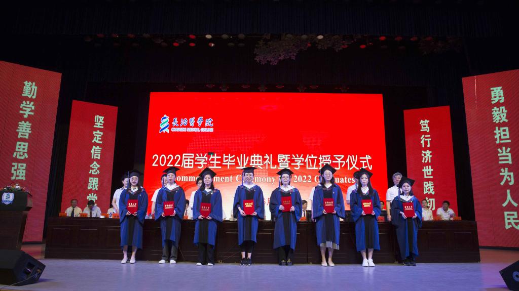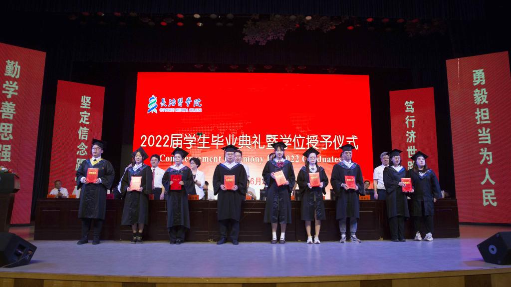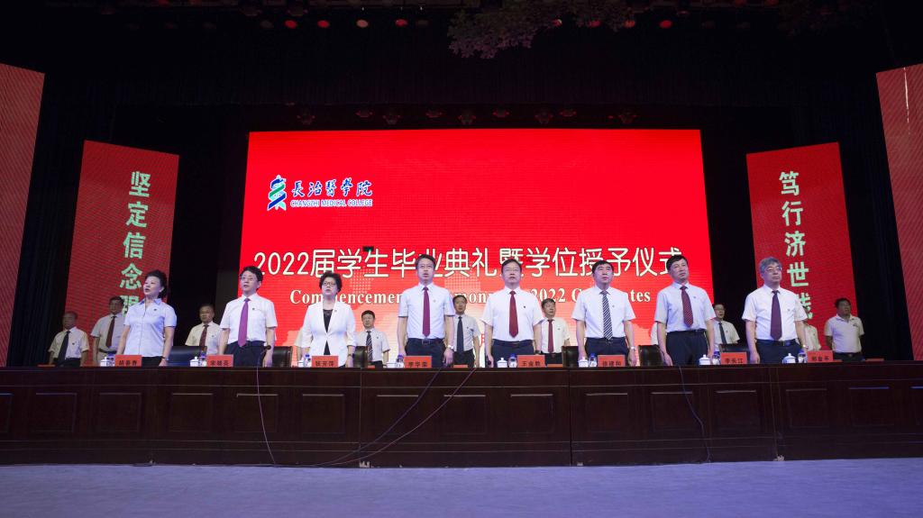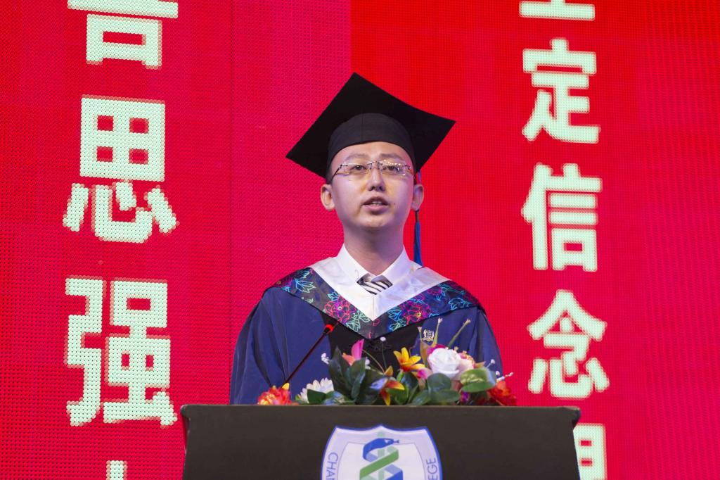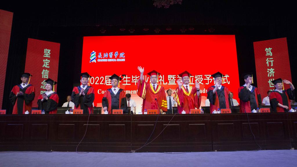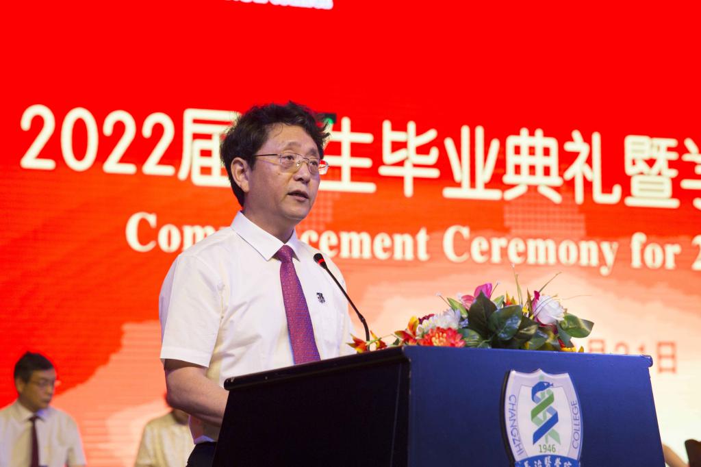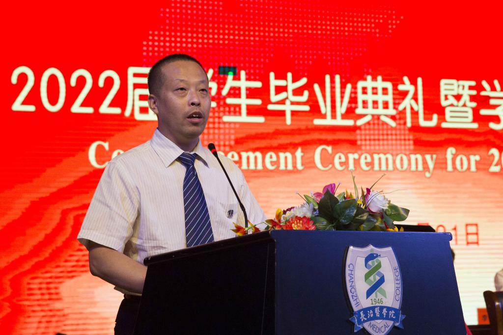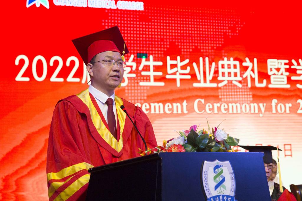 校党委副书记、校长、学位评定委员会主席王金胜教授发表了题为《奔跑向未来 续写我们的长医故事》的讲话,代表学校向圆满完成学业、开启人生新篇章的2022届毕业生表示最热烈的祝贺,向为甘当人梯、倾情奉献的老师们致以最衷心的感谢。他结合自身“高中毕业,考入大学”“大学毕业,留校工作”“考博成功,赴湘求学”“学成归来,工作至今”求学工作的四个阶段,深情讲述了自己与长医近3个“人生10年”的故事,在与长医的不解之缘、拳拳深情中体悟、传承“三大精神”,与长医同成长共进步。