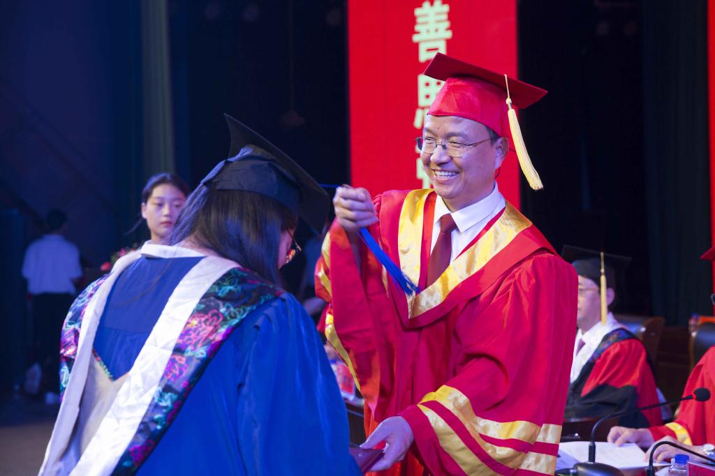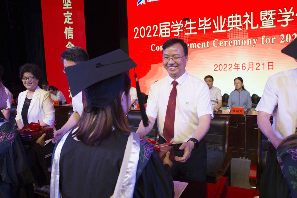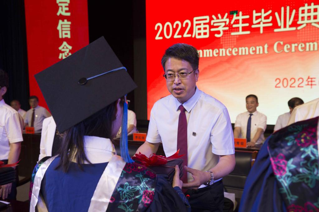 校党委副书记、校长、学位评定委员会主席王金胜教授为2022届硕士研究生逐一拨穗正冠,授予学位,颁发硕士学位证书并合影留念。