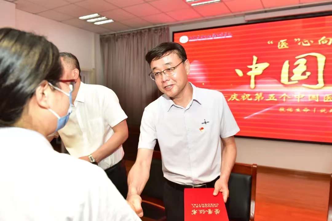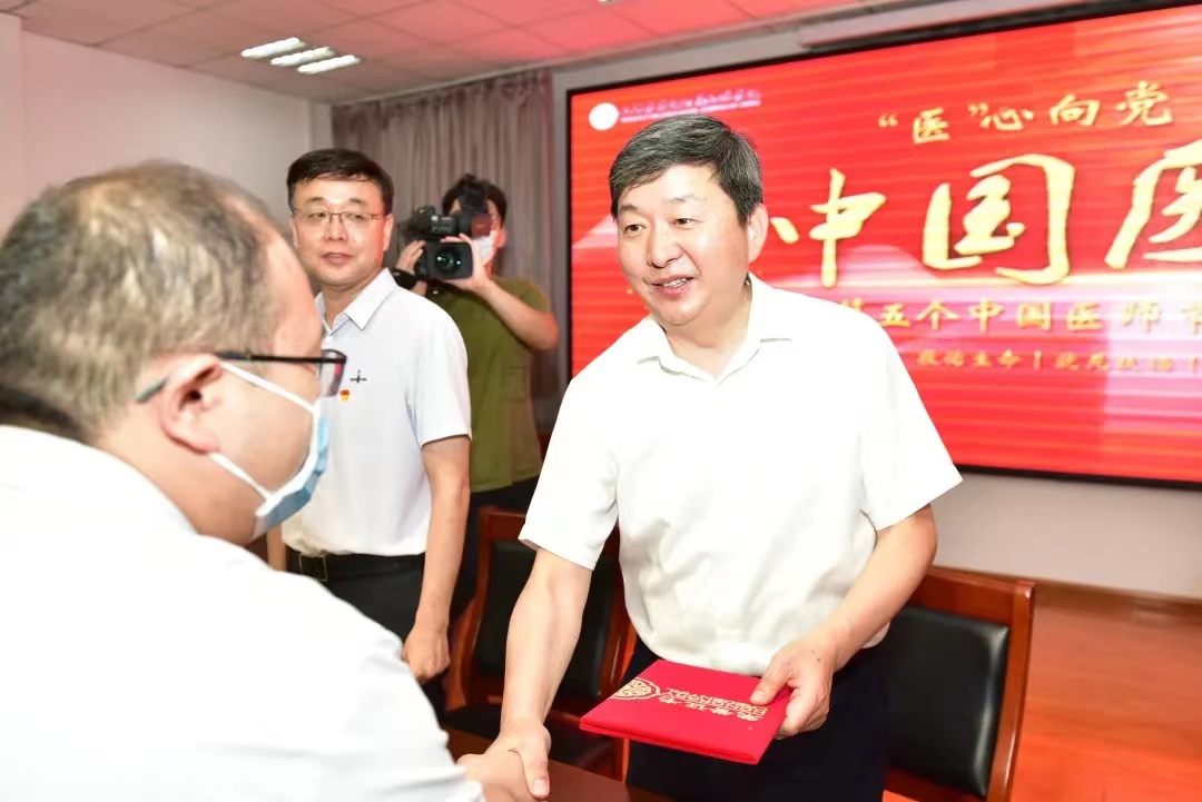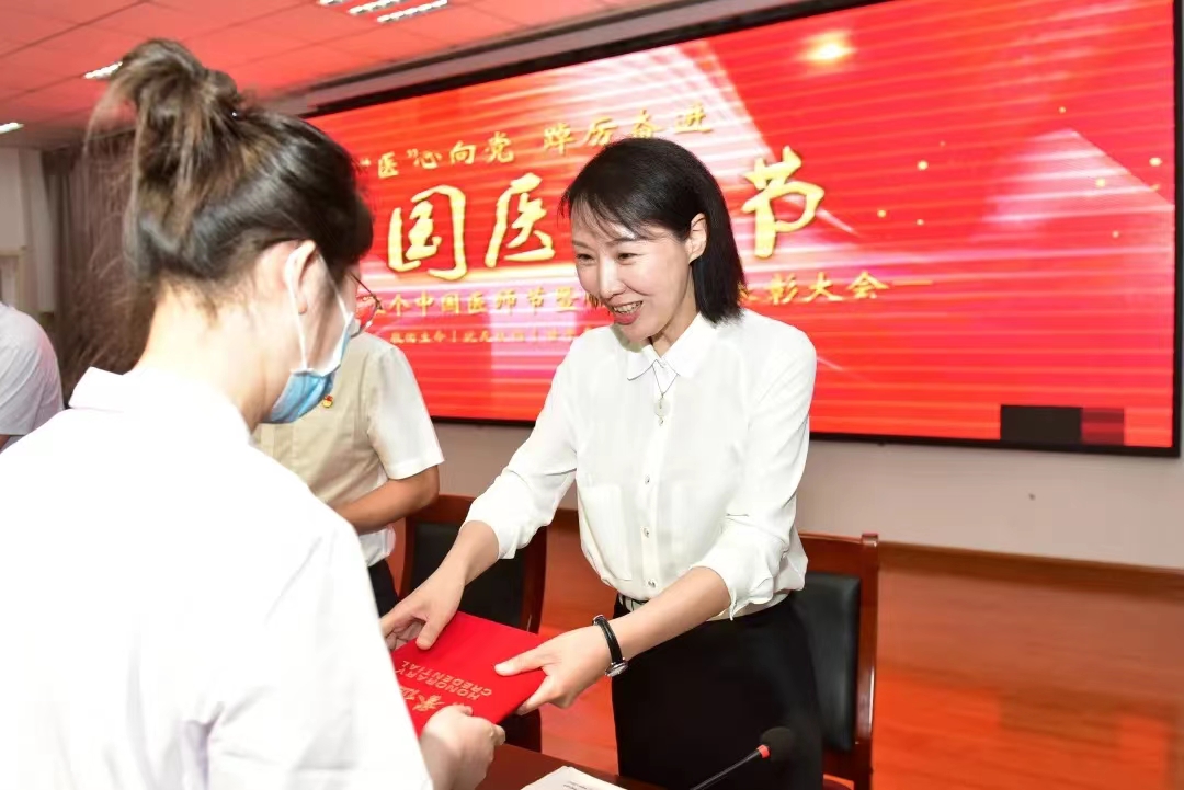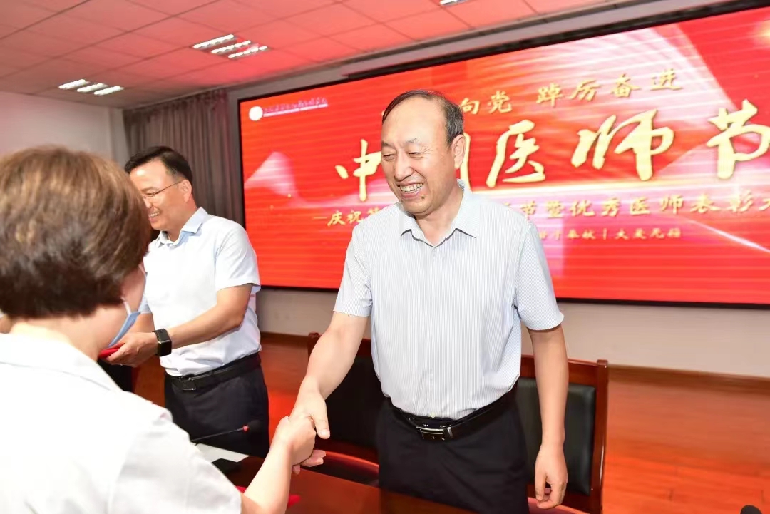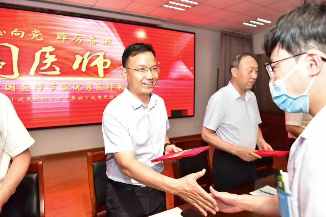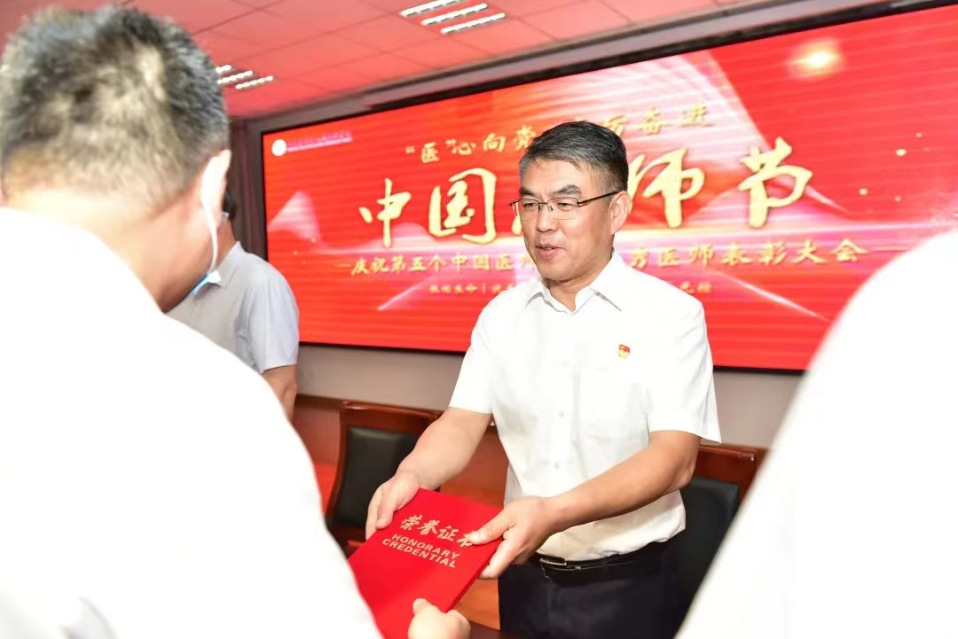 医院党委副书记王培龙宣读了《关于第五个“中国医师节”表彰优秀医师的决定》,对荣获2022年度院级“优秀医师”、“最美白衣战士”称号的医师进行表彰并颁奖。