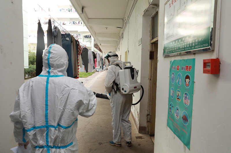 桌面推演结束后,在南区9号学生公寓进行了实战模拟演练,设置了布置警戒线、转运管控、消毒消杀、志愿者送餐等场景。