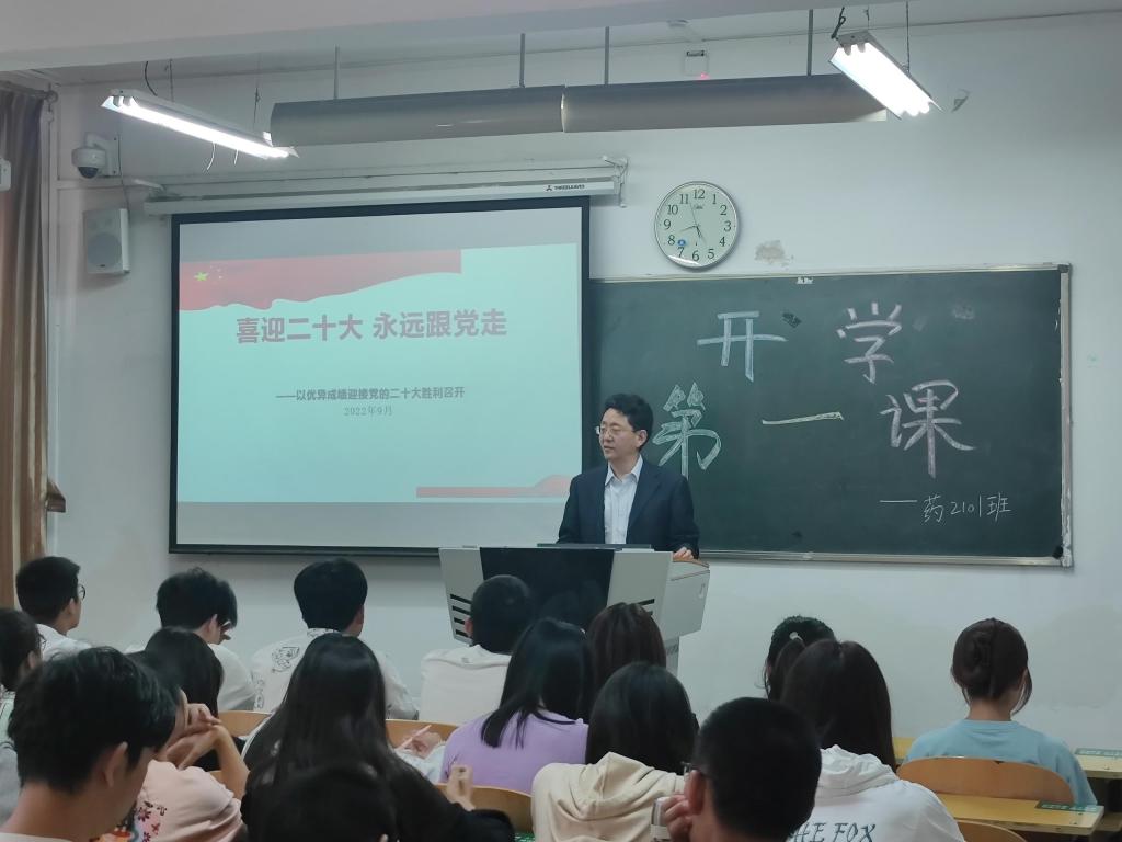 9月6日上午,党委常委、副校长宋晓亮以“喜迎二十大,永远跟党走”为主题,为联系班级药学系药2101班的同学们讲授了“开学第一课”。
