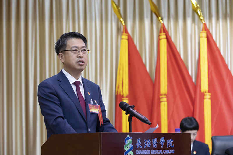 党委副书记、校长王金胜代表学校党委,向莅临大会的各位领导和各位来宾表示热烈欢迎,向参加大会的老领导和离退休老同志致以崇高的敬意,向长期以来与我们肝胆相照、并肩作战的我校各民主党派和无党派同志表示衷心的感谢,向全体代表、列席代表和全校共产党员表示诚挚的问候。他指出,本次党代会是在我省全方位推动高质量发展的关键时期,在我校全面建设特色鲜明的高水平应用型医科院校的重要时期召开的一次大会,是我校党的政治生活中的一件大事,必将对长医的改革创新和事业发展产生重要而深远的影响。五年来,在省委、省委教育工委的领导和帮助下,长医坚持“五个全面”战略布局,按照“补短板、强特色、塑精神、重服务、应用型”的办学思路,踔厉奋发、笃行不怠。希望大家深刻总结发展经验、凝聚发展共识,认清形势、同心同德,推动医学教育不断向前发展,进一步提升我校办学水平。