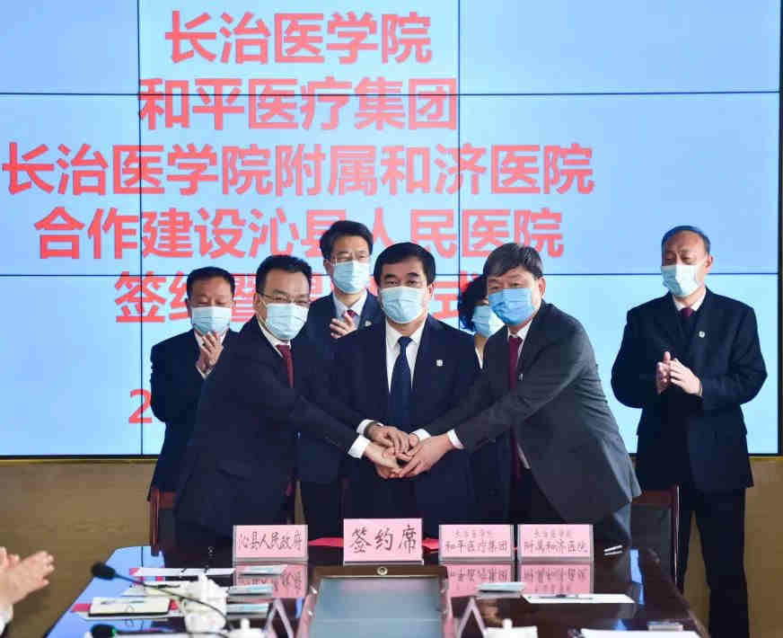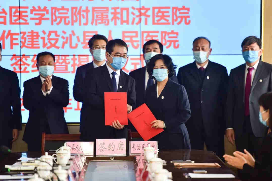县长司慧军与和平医疗集团理事长尚进平、附属和济医院院长郝少峰签署合作建设沁县人民医院(和济医院沁县分院)协议。