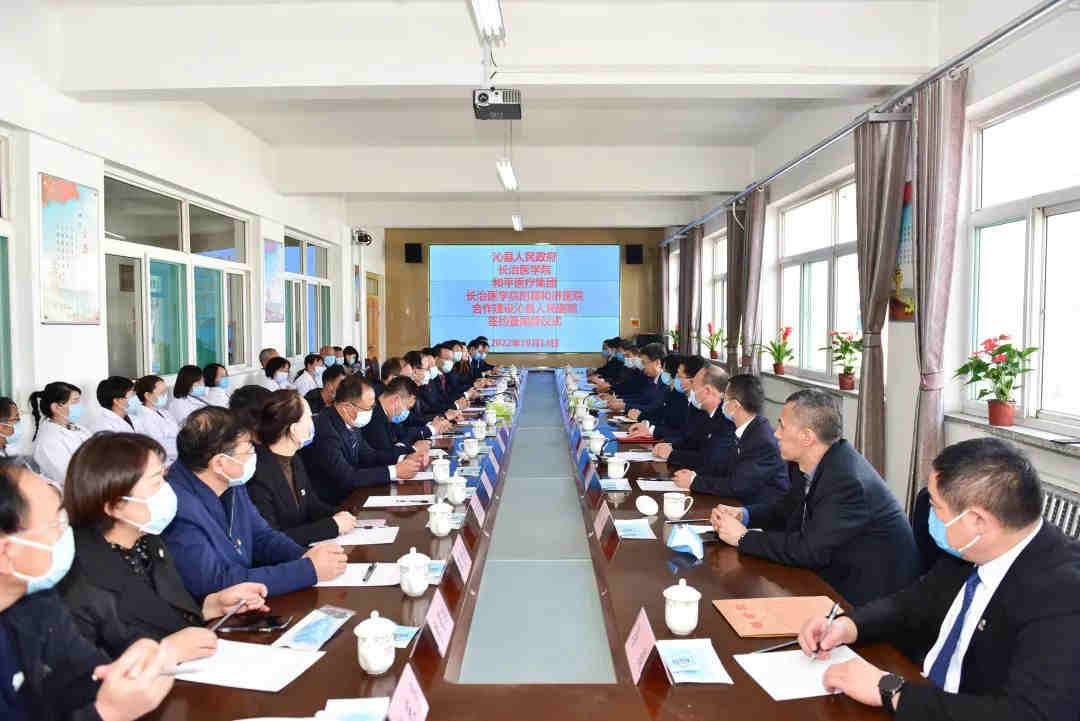 为促进优质医疗卫生资源下沉,提高县域医疗卫生服务体系和基层医疗服务能力,10月14日,沁县人民政府、长治医学院和平医疗集团和长治医学院附属和济医院合作建设沁县人民医院签约暨揭牌仪式在沁县人民医院举行。我校党委书记李华荣,副校长来丽娜,副校长、和平医疗集团理事长、和平医院党委书记尚进平;附属和济医院党委书记李永红,党委副书记、院长郝少峰,副院长王向东、牛晓红、郭伟;市人大常委会副主任、县委书记秦军,县长司慧军等有关领导出席。