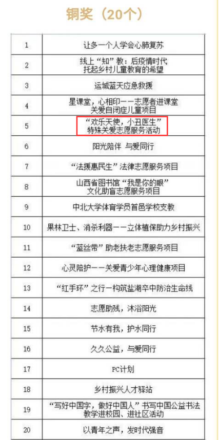 9月7日,以“志愿新时代·共筑中国梦”为主题的第三届山西省青年志愿服务项目大赛决赛在太原成功举办。我校“欢乐天使 小丑医生”志愿服务项目从46个项目中脱颖而出,荣获大赛铜奖。