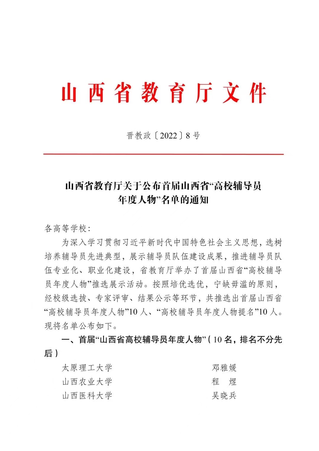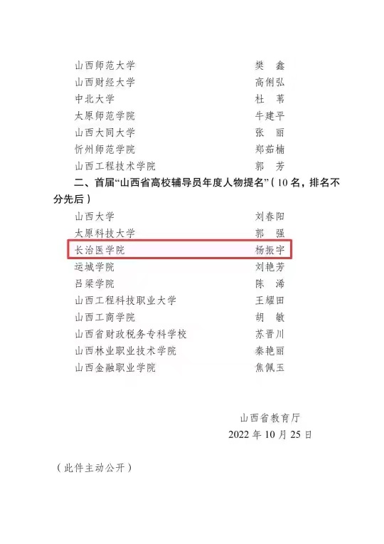 近日,山西省教育厅公布了首届山西省“高校辅导员年度人物”名单,共推选出首届山西省“高校辅导员年度人物”10人、“高校辅导员年度人物提名”10人。我校公共卫生与预防医学系团委书记、辅导员杨振宇获山西省“高校辅导员年度人物提名”。