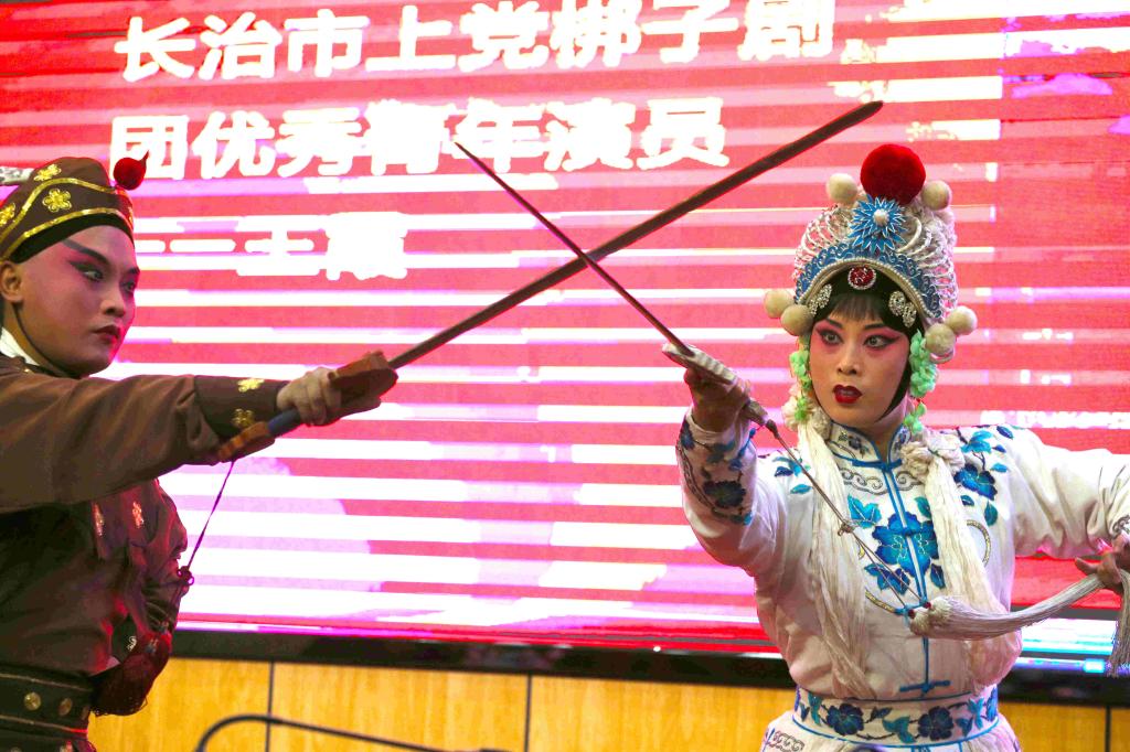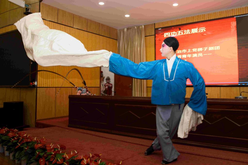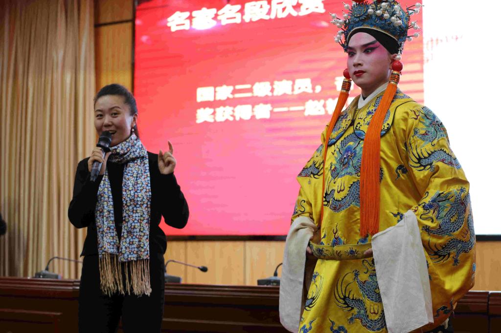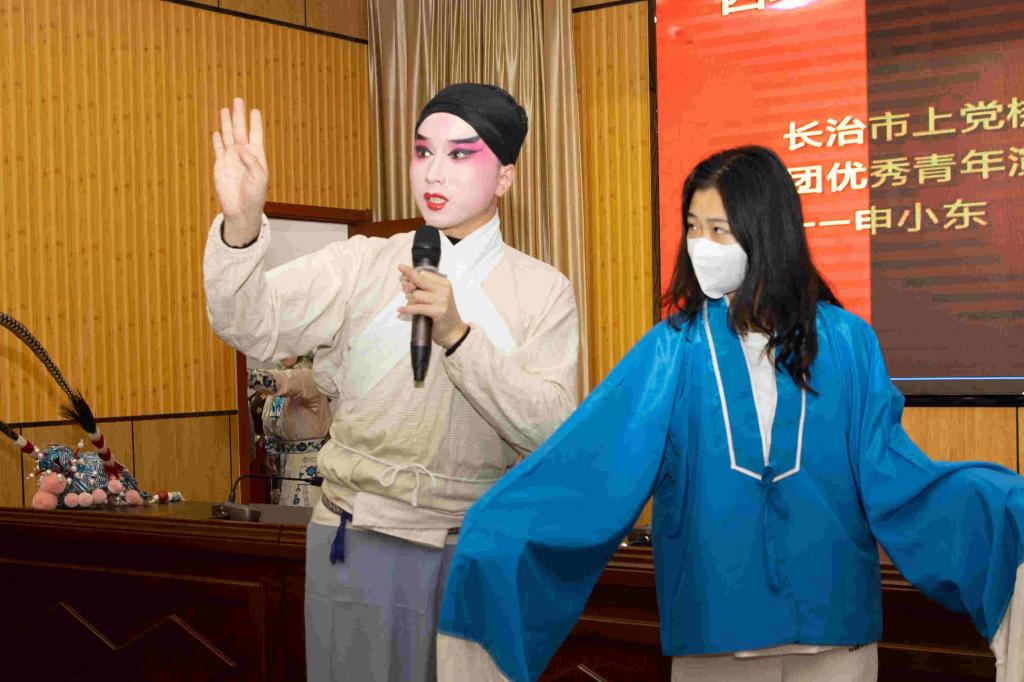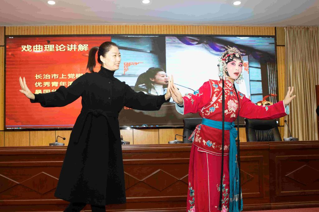 活动现场,优秀青年演员暴国华从戏曲的发展史、戏曲的特点等方面对戏曲理论进行了生动讲解。优秀青年演员申晓东、张慧敏、徐亮、王霞等进行了戏曲“唱念做打”的现场展示。国家二级演员、杏花奖获得者、非遗传承人赵艳琴,国家一级演员、杏花奖获得者、非遗传承人李学斌先后给大家带来上党梆子《三关排宴》选段、上党梆子《黄鹤楼》选段。
