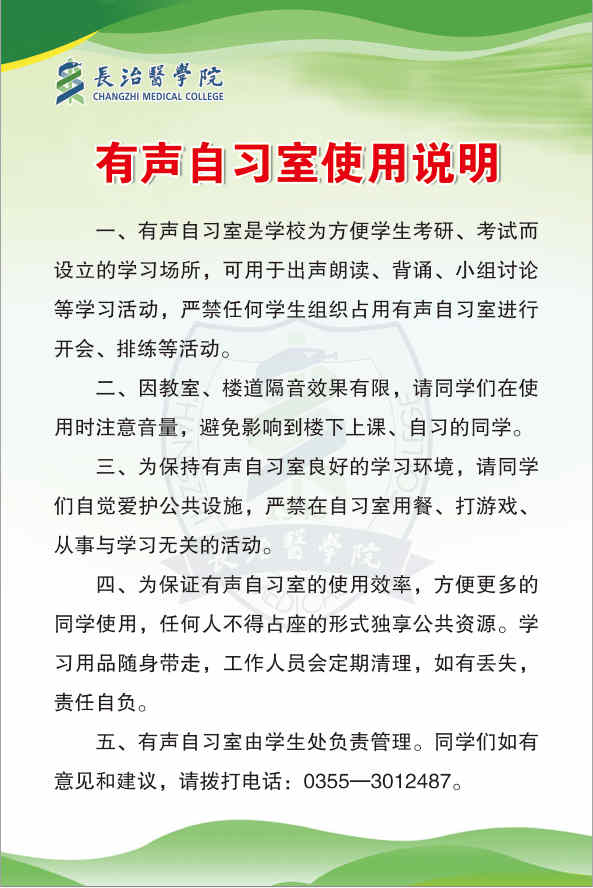 为满足同学们考研、考试背诵知识、学习讨论的需要,根据学校领导的指示,学生处协同教务处在北区明德楼(主楼)B段五层第61、62、63、64教室设立了四间“有声自习室”,用于同学们出声朗读、背诵、小组讨论等学习活动。