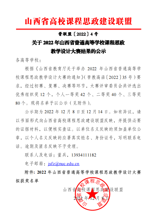 2022年山西省普通高等学校课程思政教学设计大赛是由山西省教育厅主办,山西省高校课程思政建设联盟承办。大赛旨在进一步推进我省高校“课程思政”教学改革,充分发挥教师队伍“主力军”、课程建设“主战场”、课程教学“主渠道”,不断提高教师课程思政教学能力和育人水平,全面落实立德树人根本任务。