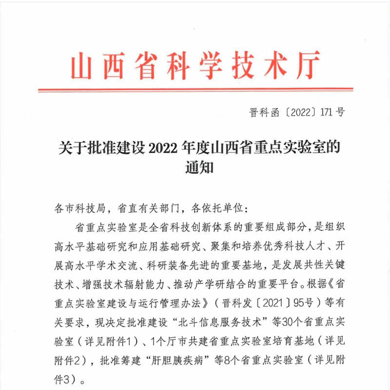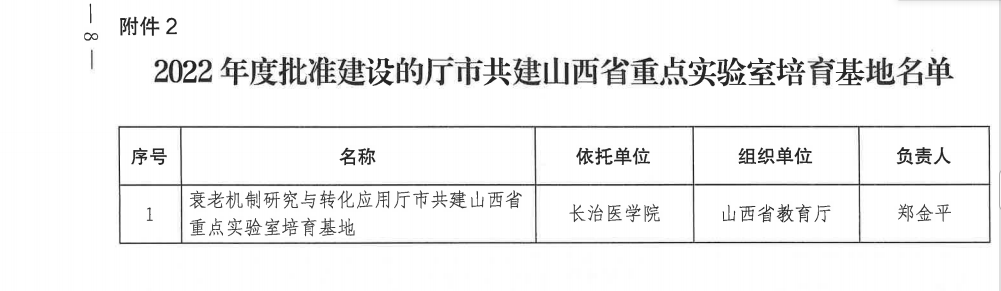 根据《山西省科学技术厅关于批准建设2022年度山西省重点实验室的通知》(晋科函[2022]171号)文件,我校申报的“衰老机制研究与转化应用厅市共建山西省重点实验室培育基地”获批立项,这是我校获批的首个省级重点实验室。