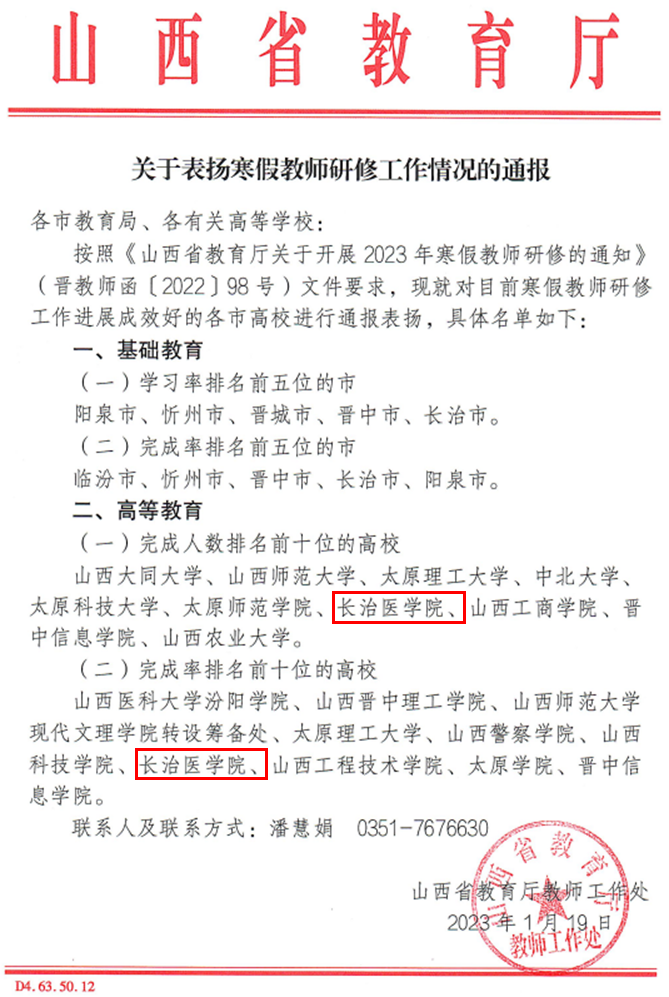 2023年寒假期间,山西省教育厅下达了《关于表扬寒假教师研修工作情况的通报》,对全省寒假教师研修工作进展成效好的高校进行了通报表扬,我校教师完成人数及完成率在全省高等教育院校中排前十名,受到了省教育厅的肯定和表扬。