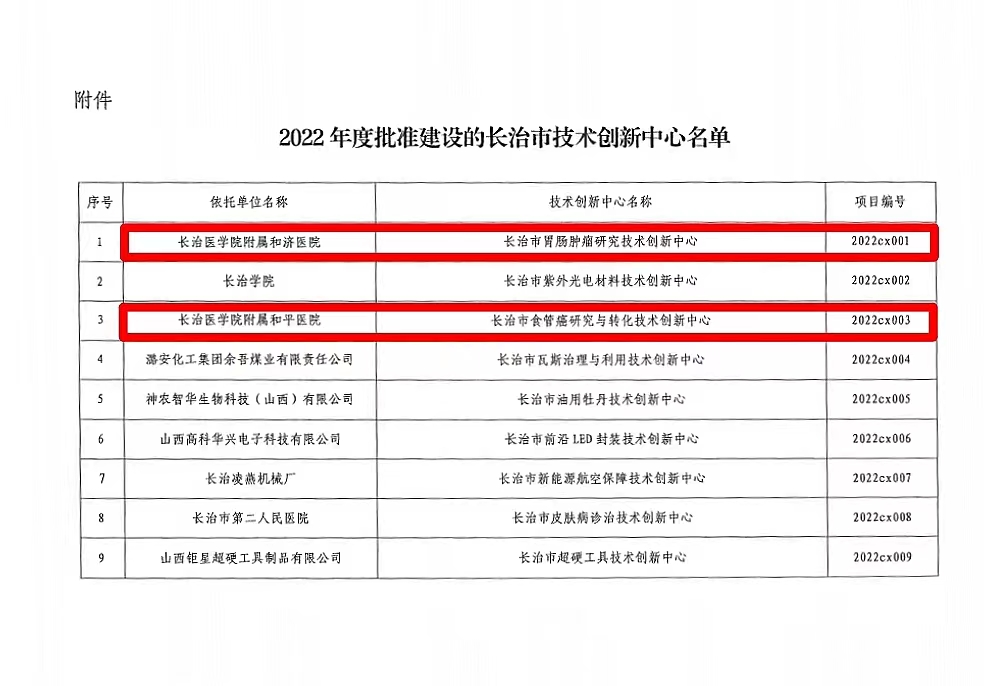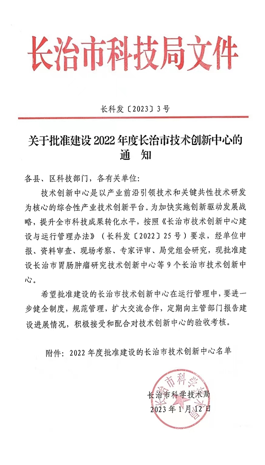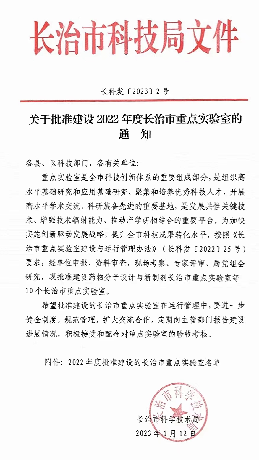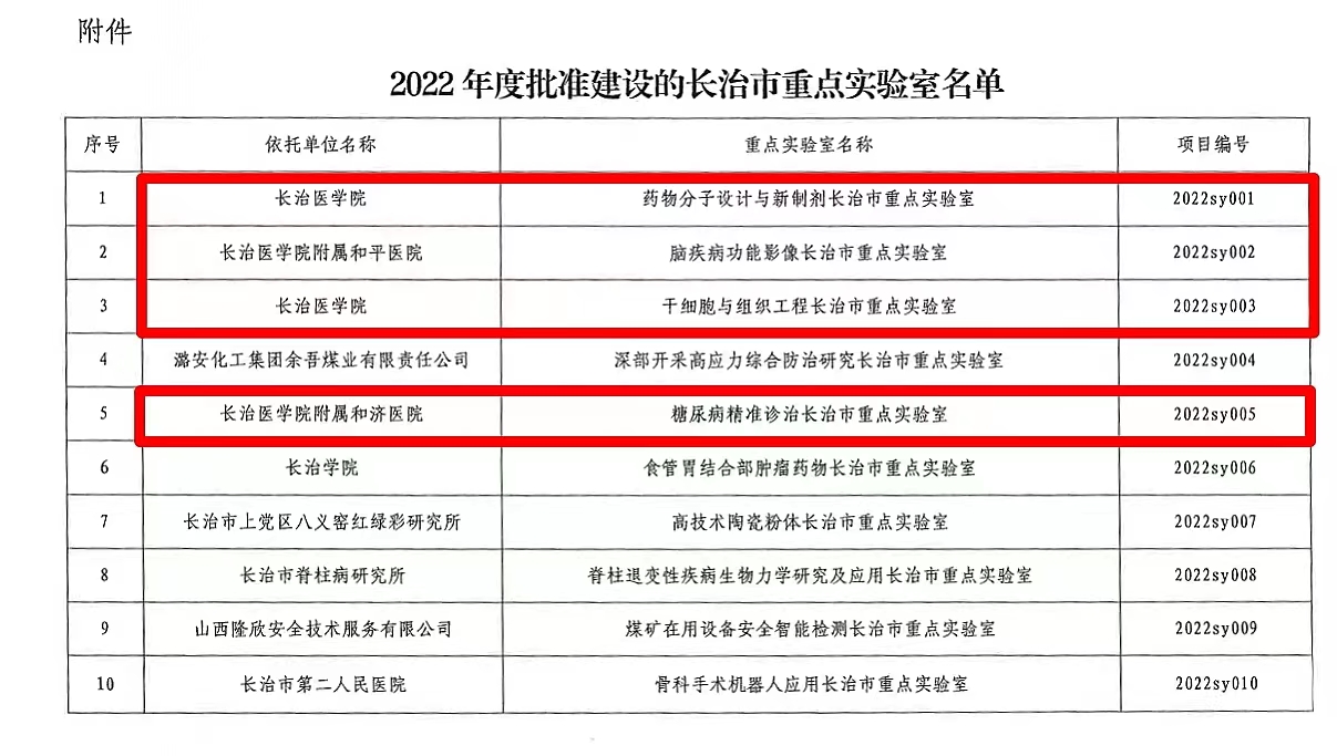 根据《关于批准建设2022年度长治市重点实验室的通知》(长科发[2023]2号)和《关于批准建设2022年度长治市技术创新中心的通知》(长科发[2023]3号),我校“药物分子设计与新制剂长治市重点实验室”“干细胞与组织工程长治市重点实验室”“糖尿病精准诊治长治市重点实验室”“脑疾病功能影像长治市重点实验室”“长治市食管癌研究与转化技术创新中心”和“长治市胃肠肿瘤研究技术创新中心”分获长治市重点实验室和长治市技术创新中心立项。这是我校在科研平台建设方面取得的又一可喜成绩,是我校近年来不断加强推动产学研协同创新,注重成果转化与应用,积极融入省市科技创新体系的结果,对促进我校科研平台建设具有重要意义。