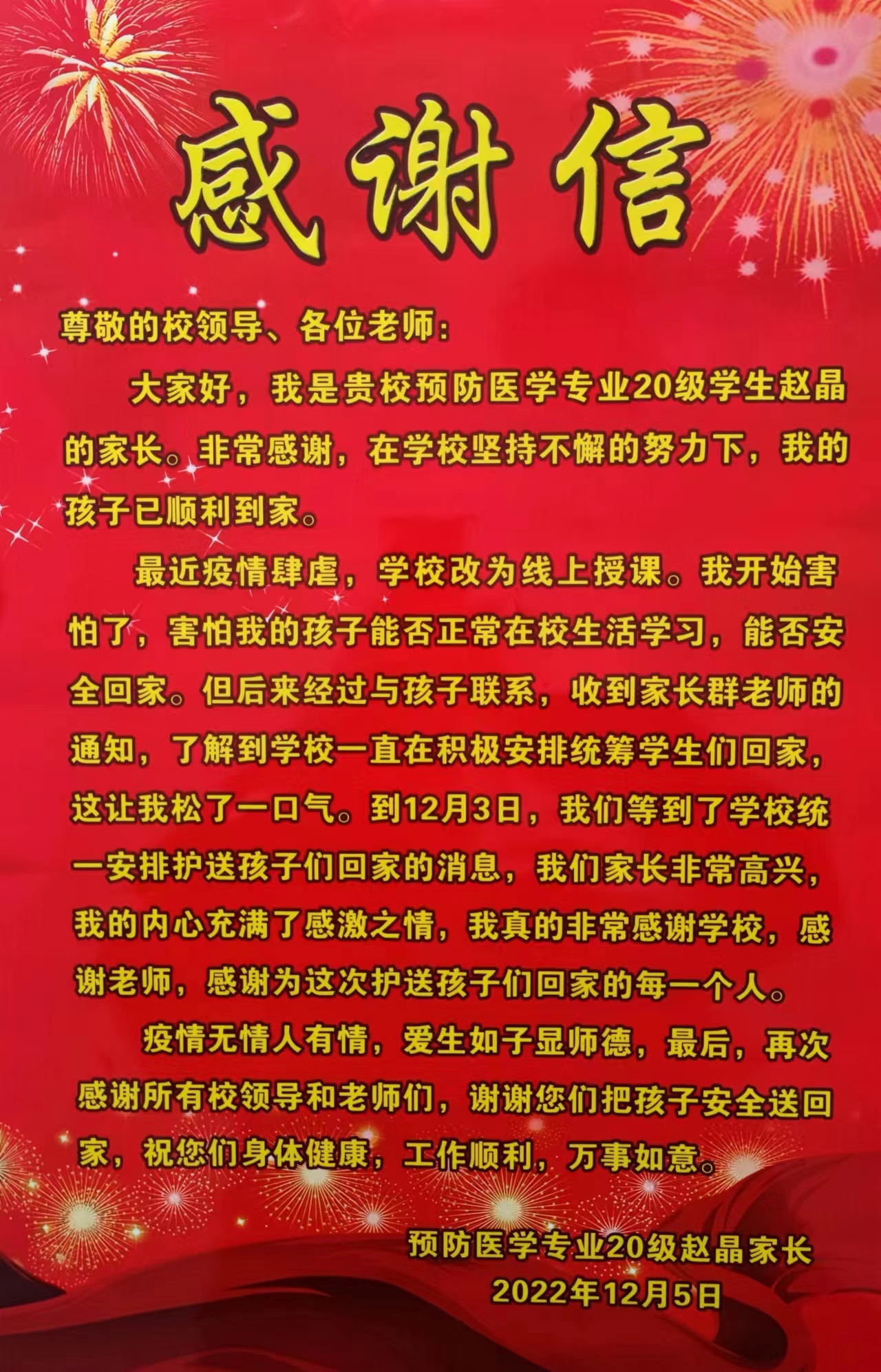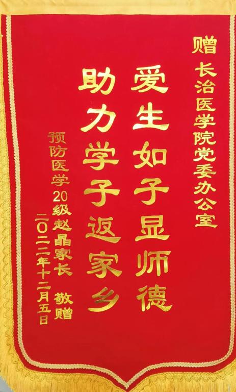 律回春晖渐,万象始更新。在同学们和着新春的节拍即将返校之际,学校收到了来自公共卫生与预防医学系2020级学生家长寄来的一面锦旗和一封感谢信。