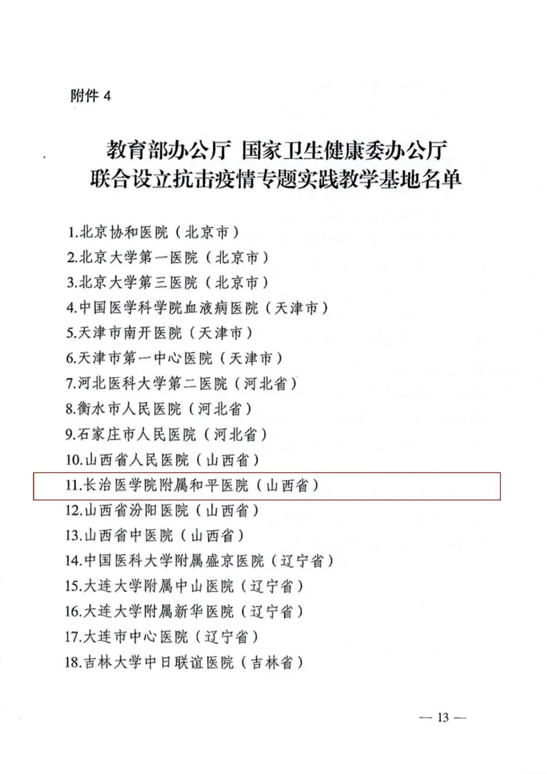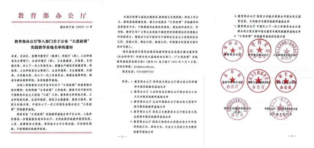 为深入贯彻落实习近平总书记关于“大思政课”的重要指示批示精神,加快构建“大思政课”工作格局,教育部办公厅、国家卫生健康委员会办公厅、科技部办公厅等八部门近日联合公布了全国首批453家“大思政课”实践教学基地,我校附属和平医院入选教育部办公厅、国家卫生健康委员会办公厅联合设立的“抗击疫情专题实践教学基地”。