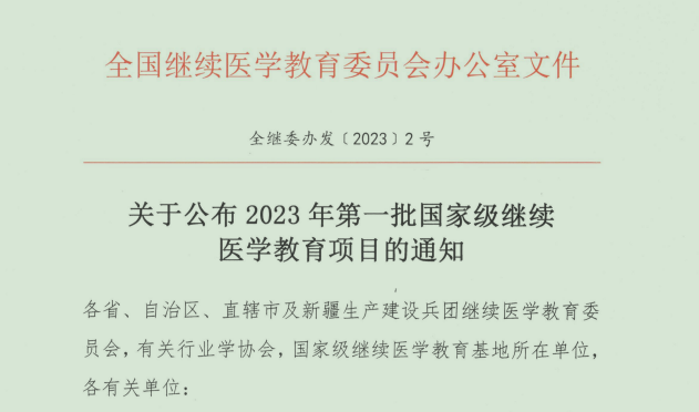 近日,全国继续医学教育委员会办公室下发《关于公布2023年第一批国家级继续医学教育项目的通知》。按照《国家级继续医学教育项目申报、认可办法》,经全国继续教育委员会学科组专家专业评审,我校共获批2023年国家级继续医学教育项目18项,其中附属和平医院获批14项、附属和济医院获批4项。
