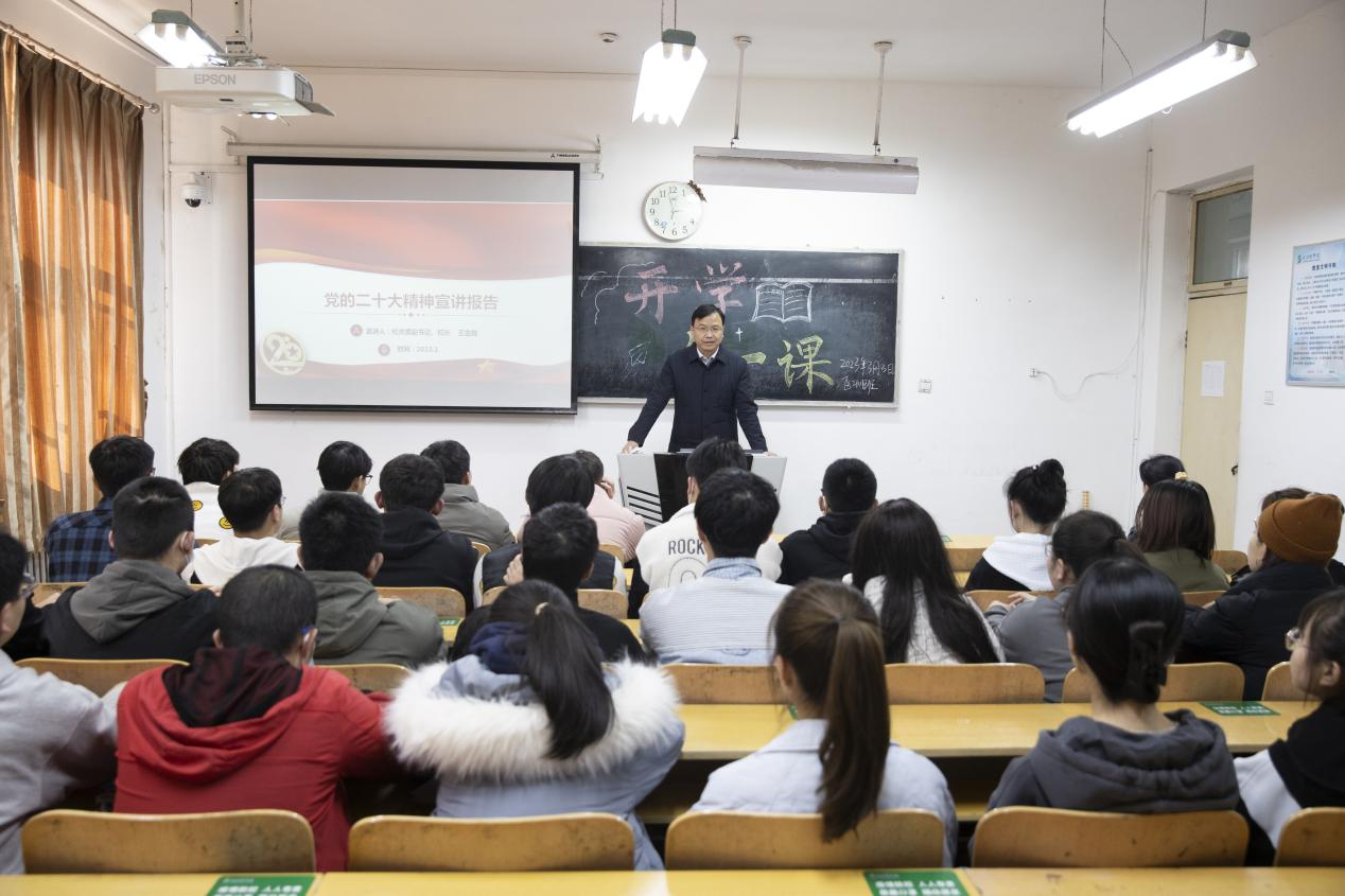 为深入学习宣传贯彻党的二十大精神,进一步推动党的二十大精神进校园,培养新时代青年敢于担当、勇于奋斗精神,3月3日下午,校长王金胜在北区46 教,为联系班级、第二临床学院2101班的同学们讲授“开学第一课”,作党的二十大精神宣讲报告。课堂由辅导员刘彩红主持。