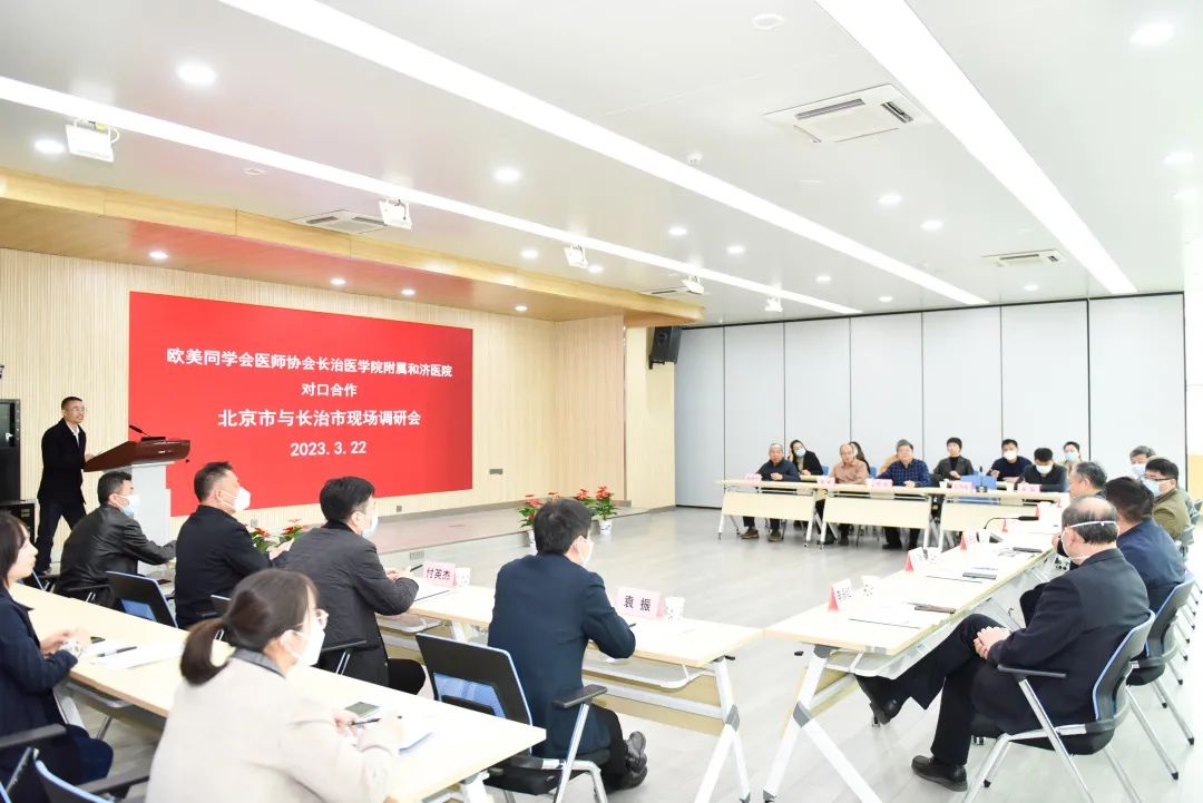 3月22日,欧美同学会医师协会长治医学院附属和济医院对口合作·北京市与长治市对口合作现场调研会在附属和济医院临床技能中心召开。北京市支援合作办二级巡视员赵振业、四处处长邵明阳、研究室一级主任科员袁振、四处一级主任科员付英杰,长治市发改委副主任刘晓、科教科科长刘李斌、农经科科长丁晖,欧美同学会医师协会副会长秘书长郑宏、心血管分会副秘书长杨斌,长治市卫健委副主任魏魏、医政医管科科长吴军出席会议。附属和济医院党委书记李永红,党委副书记、院长郝少峰,原副院长田步升,副院长王向东以及各相关职能科室负责人参会。会议由王向东主持。