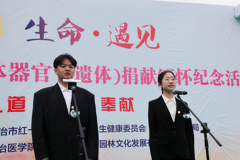 “您的生命创造出新的传奇,使春回大地,万物复苏。往日奄奄一息的生命,如今神采飞扬,昂首阔步......”缅怀仪式上,我校志愿者霍纪燕、王勃焱朗诵了《生命的礼物》,颂扬了捐献者的大爱之举。