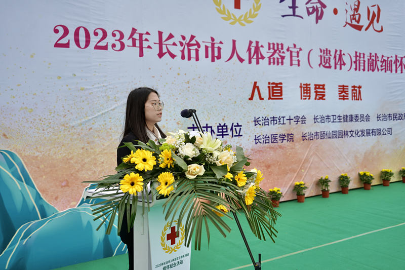 默哀结束后,长治市红十字会党组书记、专职副会长丁向东致辞。他总结了长治市近年来在器官(遗体)捐赠方面的进展,呼吁大家带头树立科学观念,移风易俗,争当文明进步的先锋,用爱心和奉献,使那些期盼得到器官移植的患者能够早日获得重生,让生命得到传承和延续。他希望各界爱心人士、爱心机构都能够关注人体器官(遗体)捐献事业,希望广大媒体能对人体器官(遗体)捐献工作给予大力的支持和广泛的宣传,也希望在场的红十字志愿者和捐献登记者能够成为红十字公益事业的宣传者、推动者和倡导者。