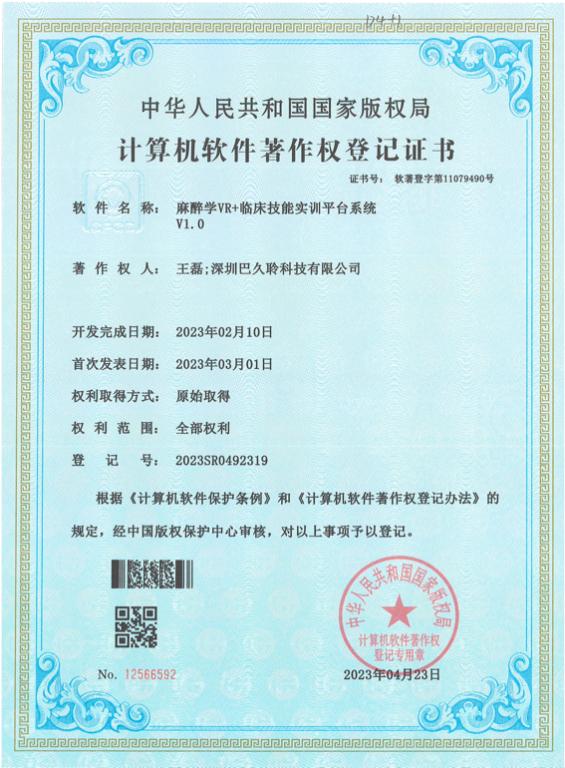 《麻醉学VR+临床技能实训平台系统V1.0》软件系统,是“麻醉学VR+临床技能实训平台建设”的技术核心。为加强知识产权保护和提高应用推广价值,王磊与巴久聆公司作为共有著作权人,联合启动软件著作权申报工作,经过积极准备,最终成功获批。