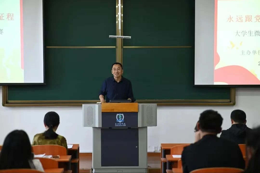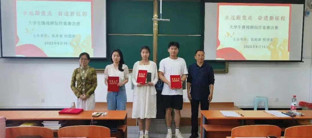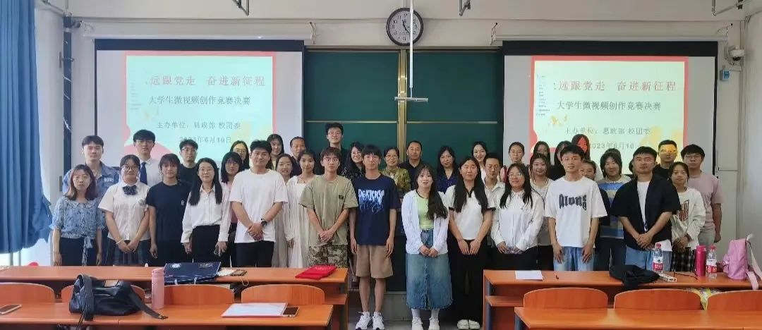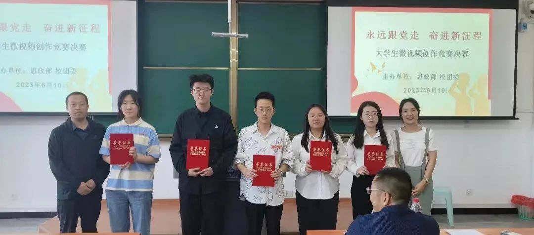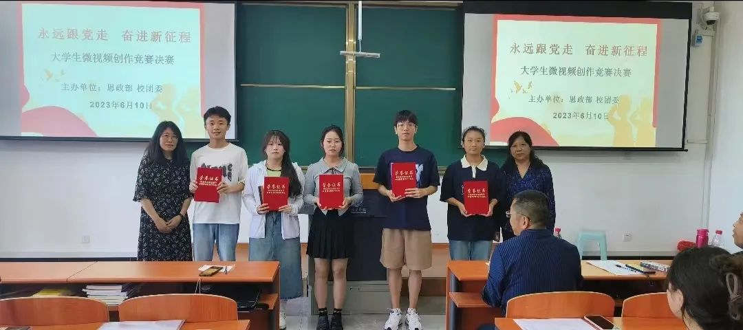 为了深入开展学习贯彻习近平新时代中国特色社会主义思想主题教育,全面贯彻落实习近平总书记关于“大思政课”建设的重要指示批示精神,充分发挥高校思政课立德树人的关键课程作用,以实际行动贯彻落实党的二十大精神。由思政部、校团委联合举办的“永远跟党走 奋进新征程”大学生微视频竞赛决赛于6月10日上午在润智楼402教室举行。思政部主任王必胜教授、副主任柴树鹰、牛翠萍教授,校团委宣传科长郭欣,教务处教务科长李建忠担任评委,广大师生现场观摩。决赛由学生宋旗、张梦倩主持。