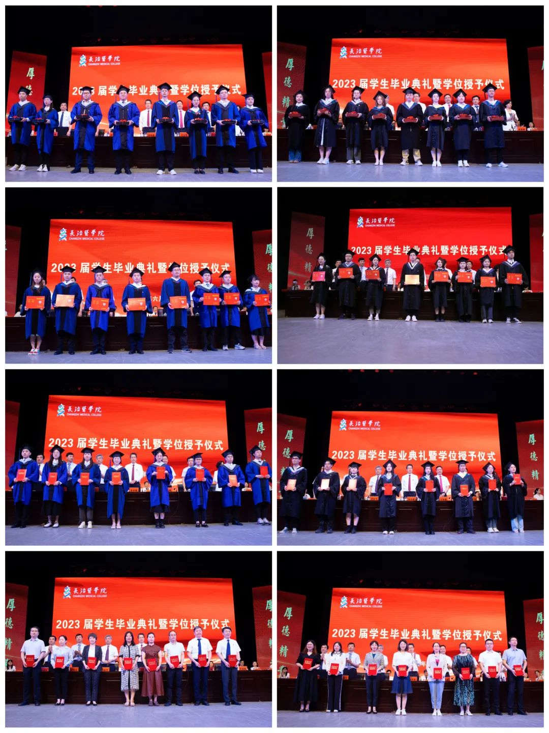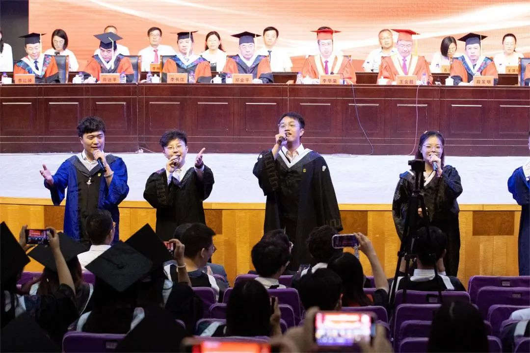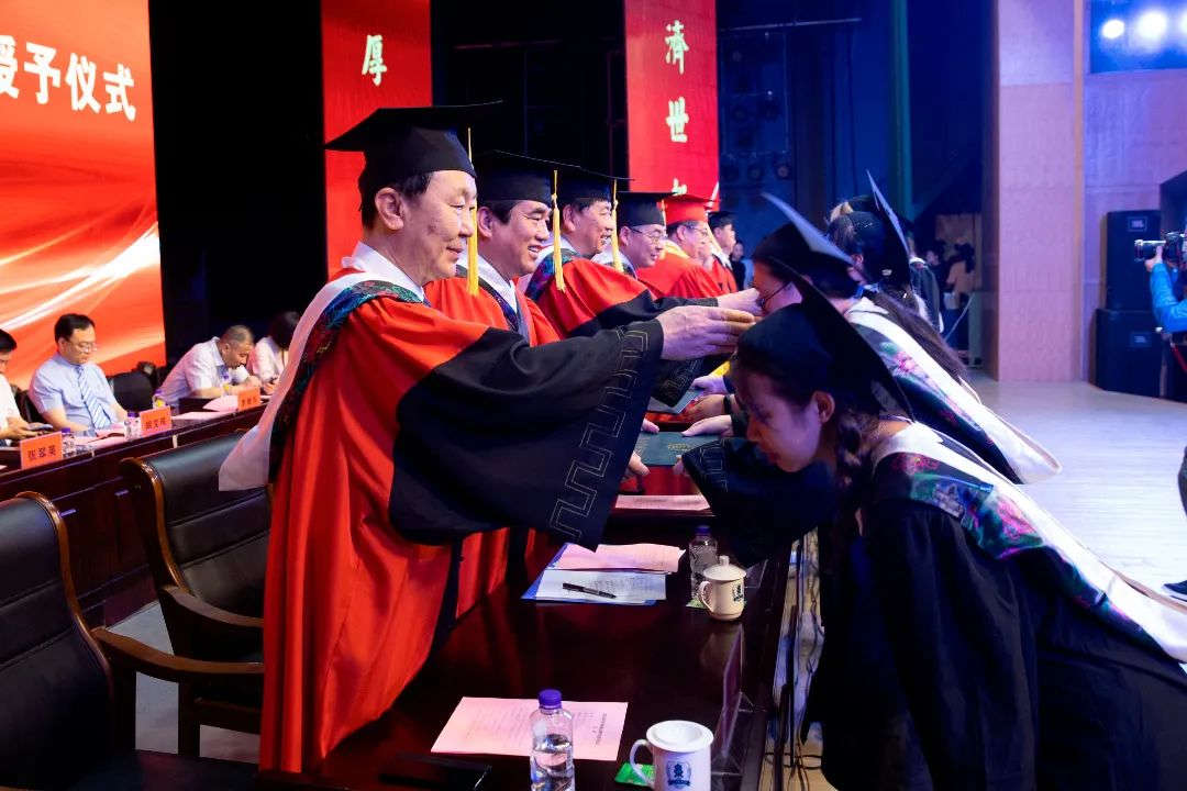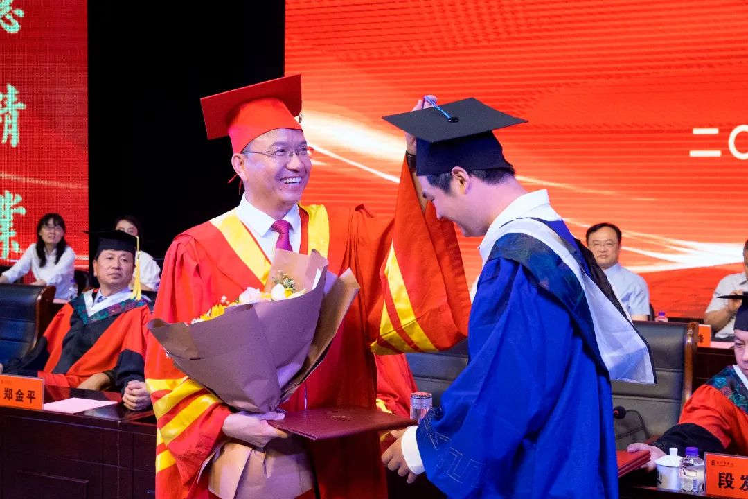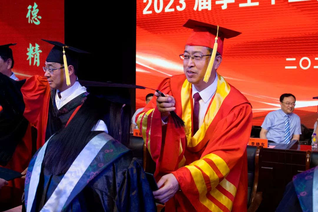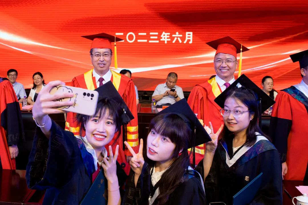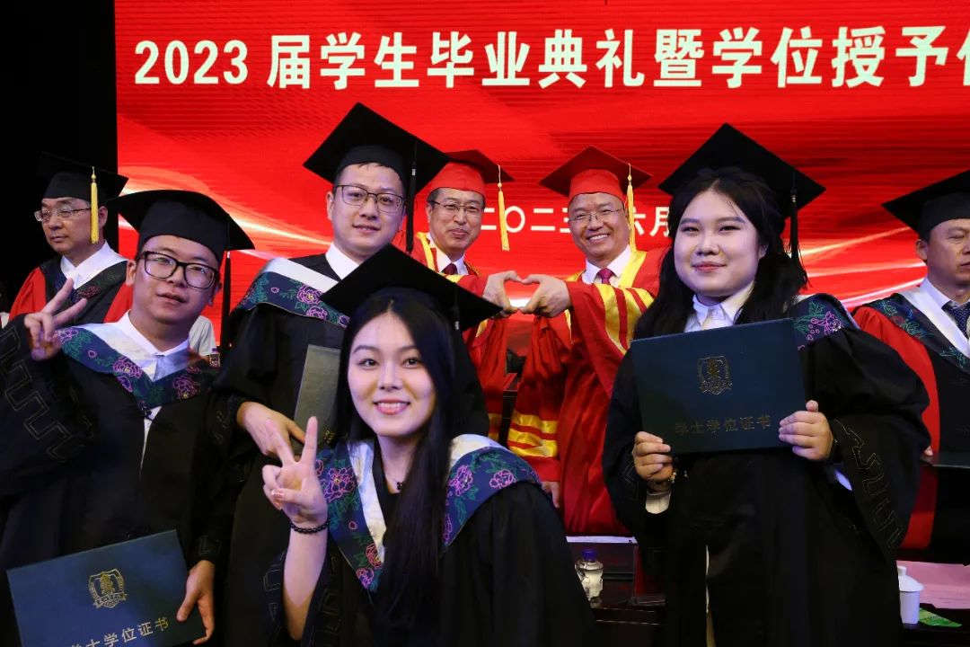 随后,2023届研究生身着硕士服依次走上主席台,校学位评定委员会主席、校长王金胜教授为他们逐一拨穗正冠,并颁发硕士学位证书合影留念。在主席台前排就座的校领导、学位评定委员会成员为本科毕业生拨穗正冠,并颁发学位证书合影留念。