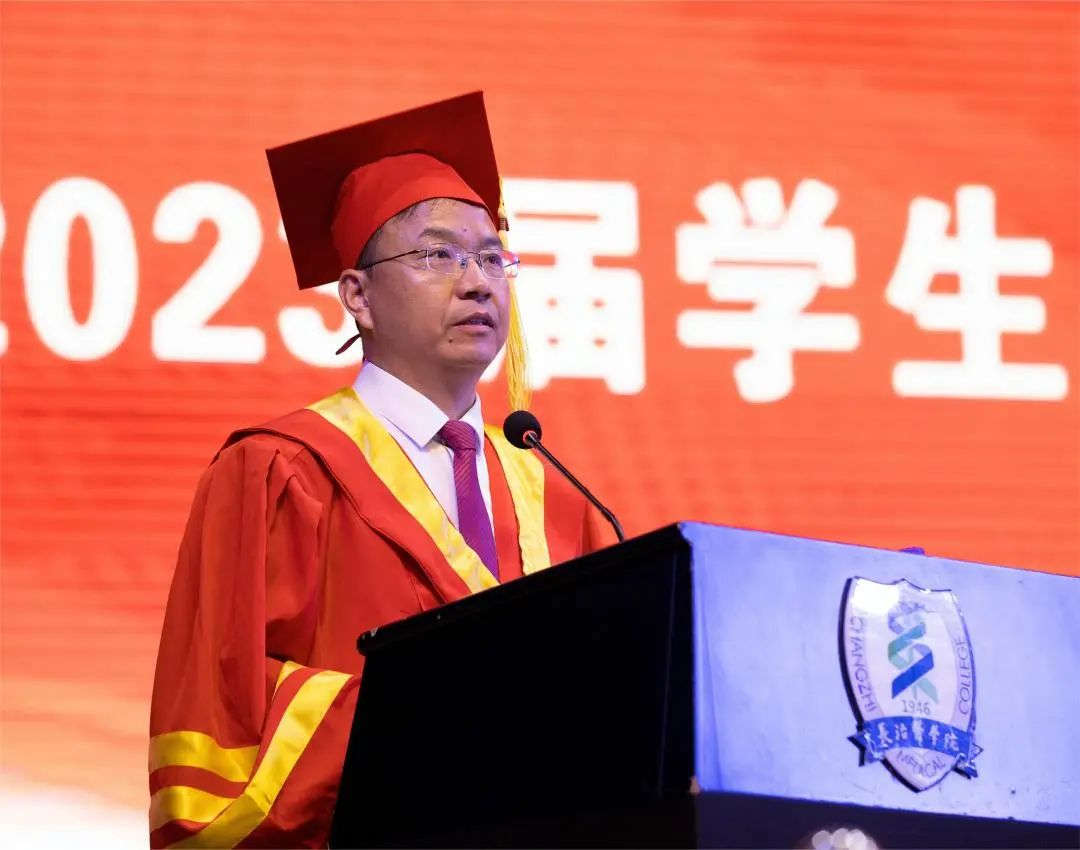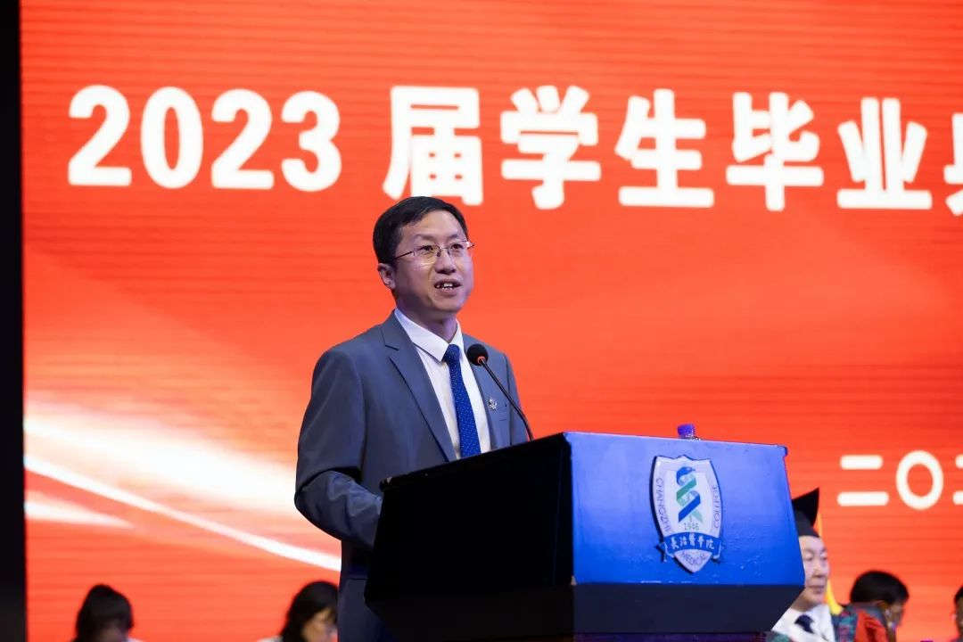 校党委副书记、校长王金胜教授发表了题为《从长医启航,重医学实践、建时代新功》的致辞,代表学校向砥砺奋进、学有所成的2023届毕业生们表示热烈的祝贺,向含辛茹苦、任劳任怨的家长们致以崇高的敬意,向甘当人梯、辛勤育人的全体教职员工表示衷心的感谢。他表示,同学们作为母校发展建设的参与者和见证者,共同见证了我校全力抗击疫情、人才培养质量稳步提升。