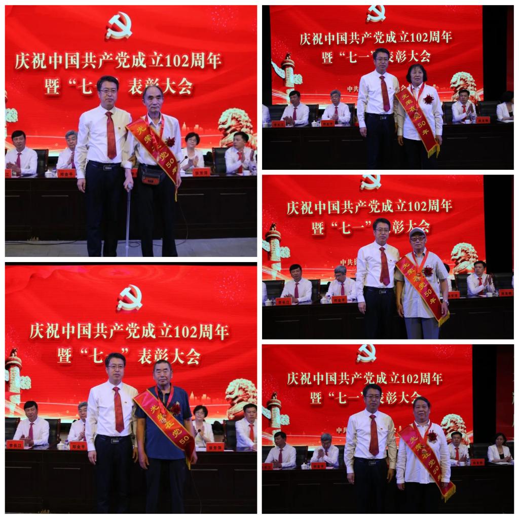 党委书记李华荣同志为“光荣在党50年”老党员们颁发纪念章,并一一合影留念。