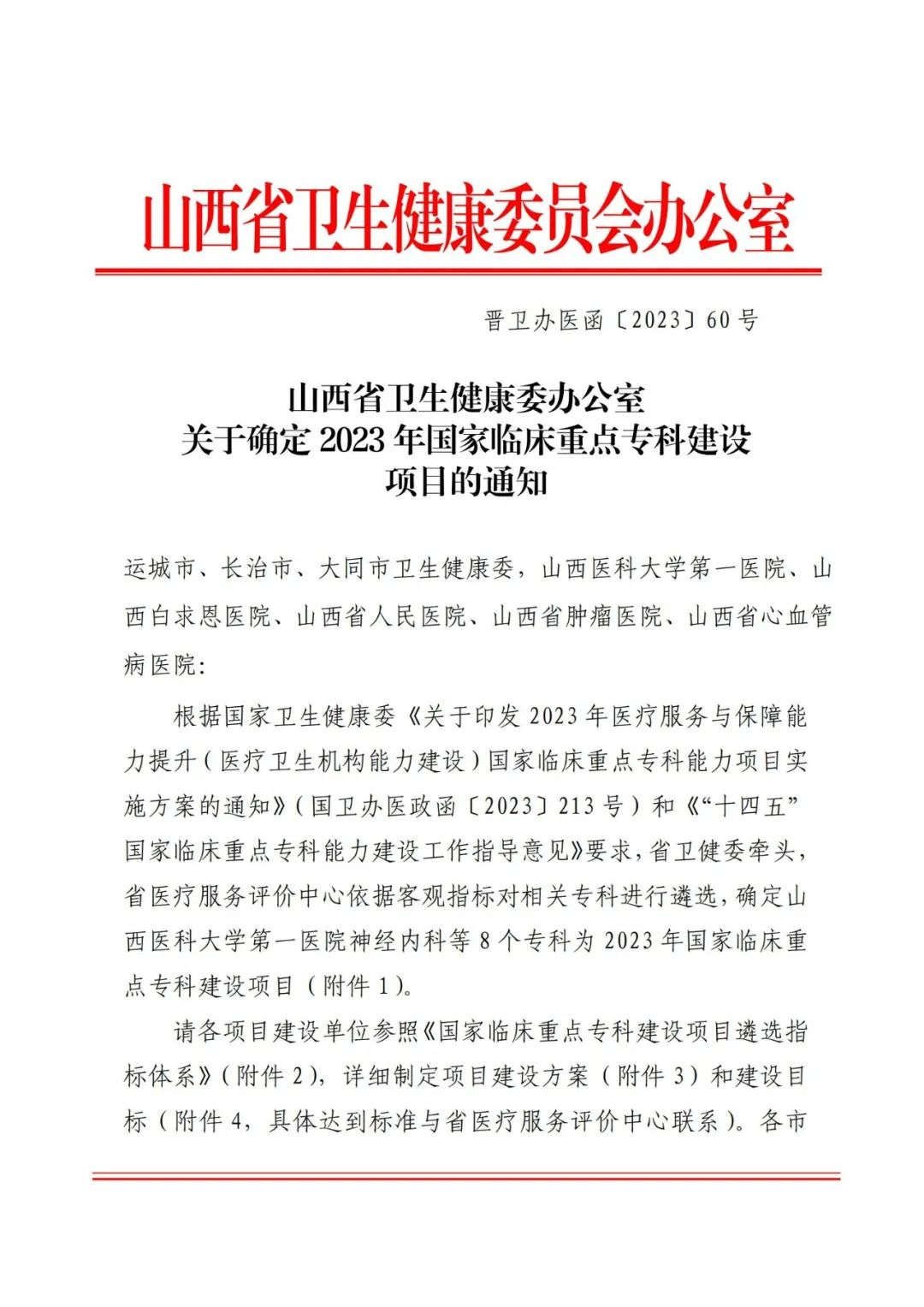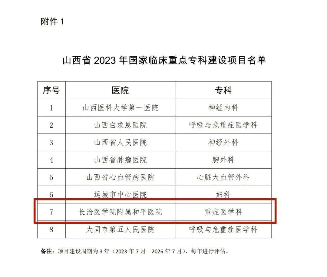 近日,山西省卫生健康委员会下发《关于确定2023年国家临床重点专科建设项目的通知》(晋卫办医函〔2023〕60号),确定我省8个专科为2023年国家临床重点专科建设项目,我校附属和平医院重症医学科成功入选。这标志着附属和平医院重症医学科跨入国家一流临床专科行列,实现了医院向“国字号”进军征程上的历史性突破。