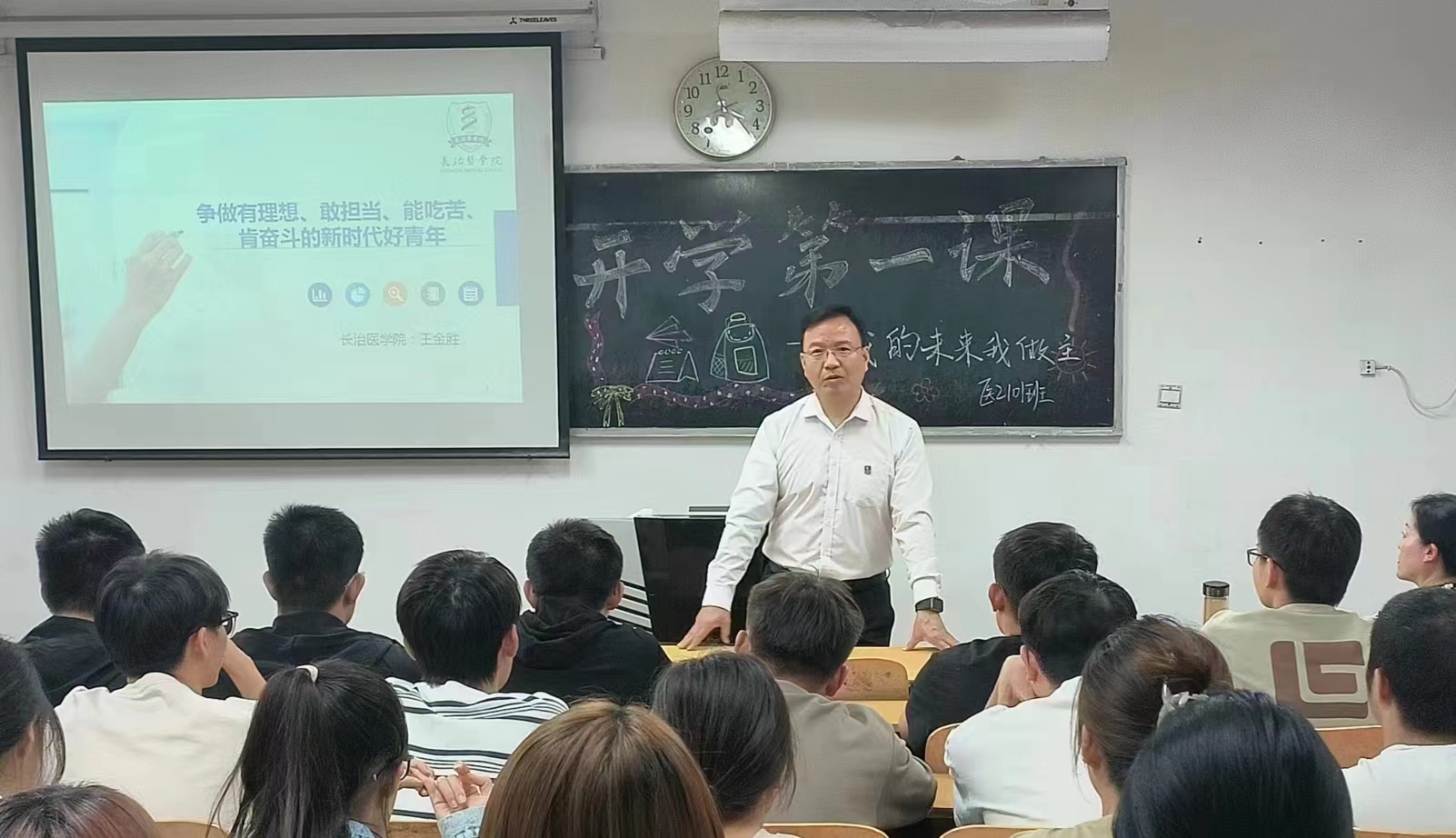 为深入贯彻落实党的二十大报告中习近平总书记对青年寄予的深切厚望,引导青年学生争做有理想、敢担当、能吃苦、肯奋斗的新时代好青年,9月21日下午,校长王金胜在北区46教为联系班级第二临床学院医2101班的同学们讲授“开学第一课”。课堂由辅导员刘彩红主持。