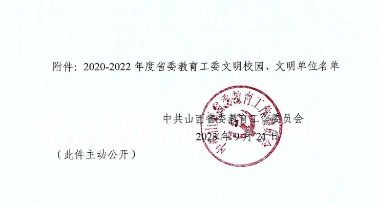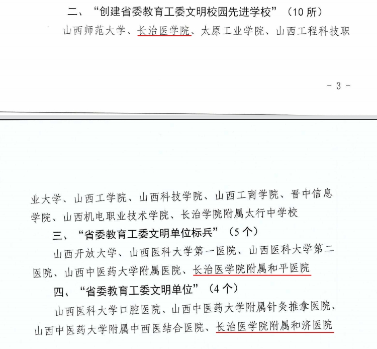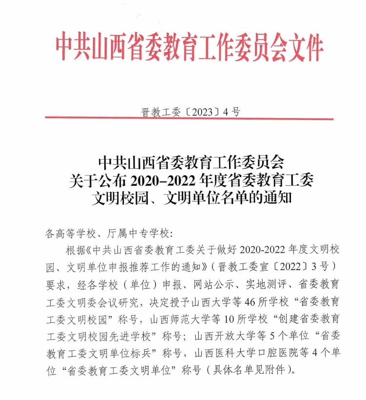 根据《中共山西省委教育工作委员会关于公布 2020-2022年度省委教育工委文明校园、文明单位名单的通知》(晋教工委〔2023〕4号)文件公布,经学校申报、网站公示、实地测评后,省委教育工委文明委会议研究决定,我校获评“创建省委教育工委文明校园先进学校”、附属和平医院获评“省委教育工委文明单位标兵”、附属和济医院获评“省委教育工委文明单位”。