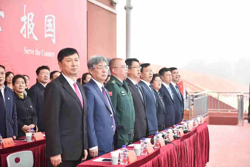 国旗护卫队铿锵提步,国歌奏响,全体人员行注目礼,共唱国歌。