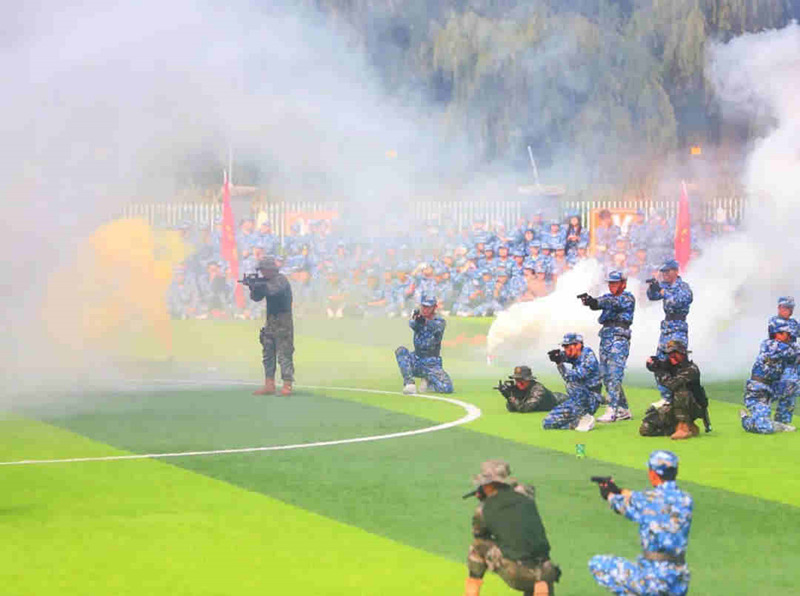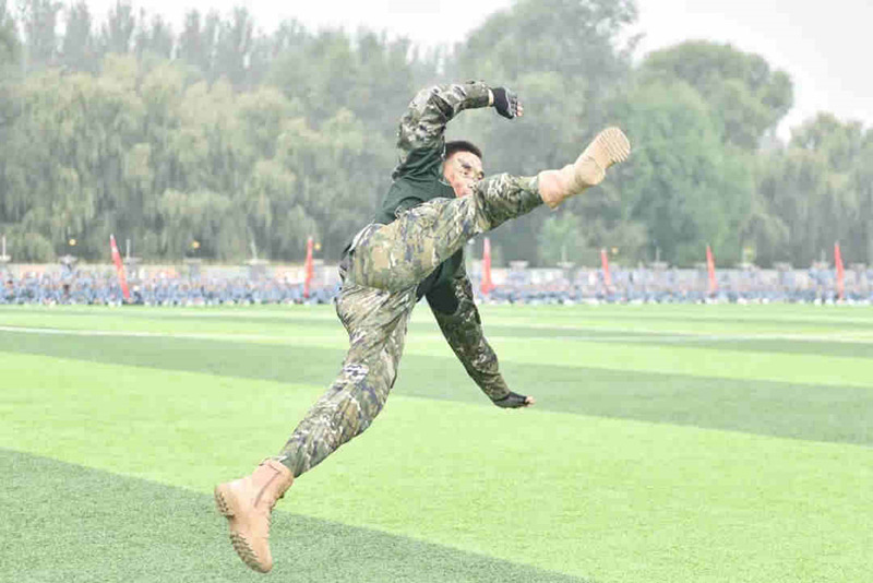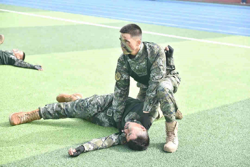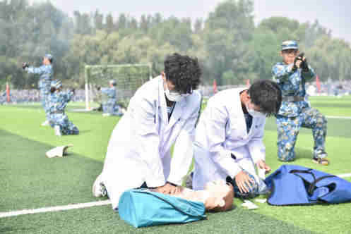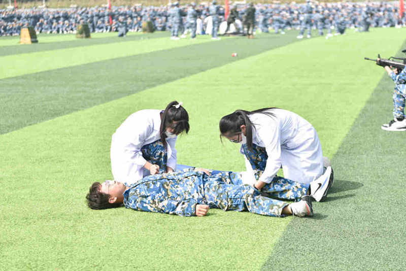 分列式汇报结束后,受训学生方队进行了队列动作、擒敌拳、匕首操表演,展示了2023级学子昂扬向上的精神风貌;承训教官进行了队列动作、擒敌格斗示范表演,给每一位长医学子作了表率;承训教官和学生共同开展战地救援,展示了长医学子过硬的军事素养和精湛的战地救援技能。