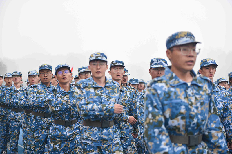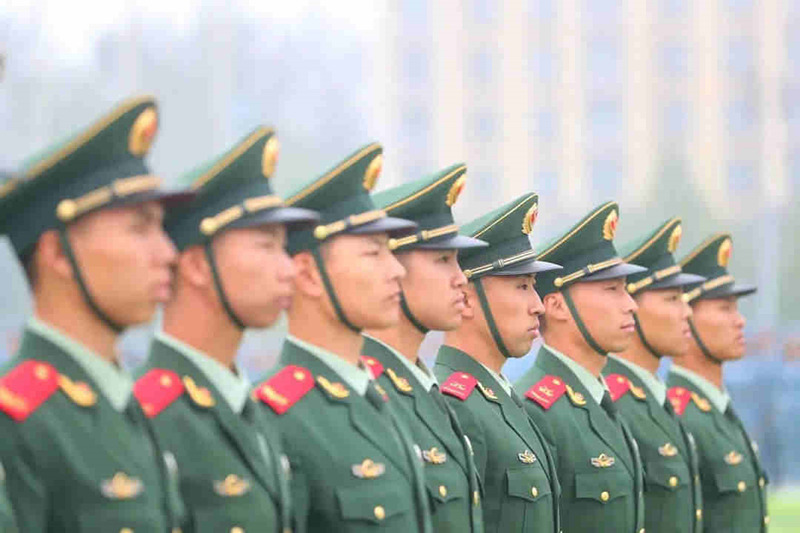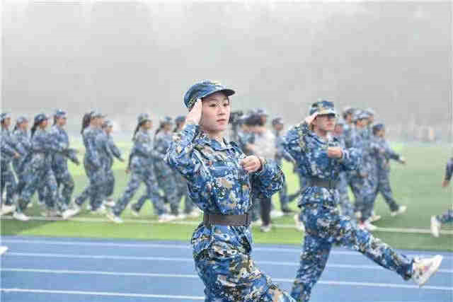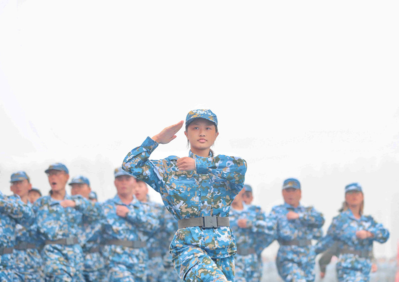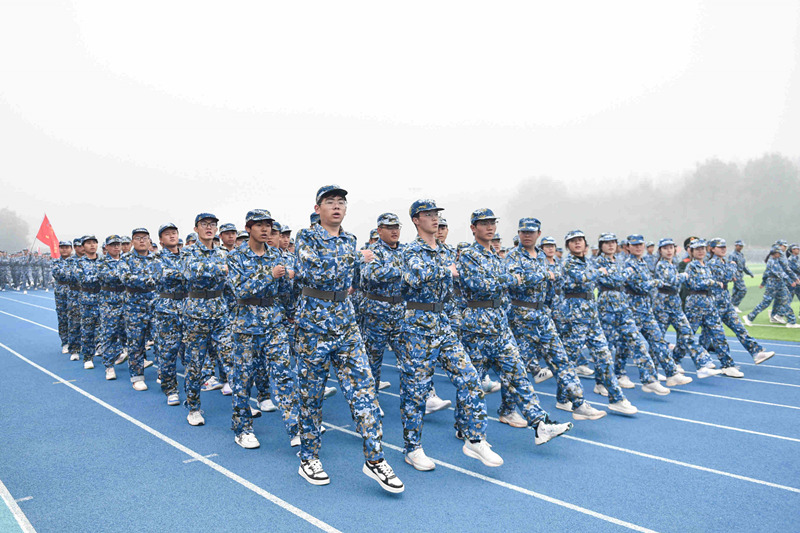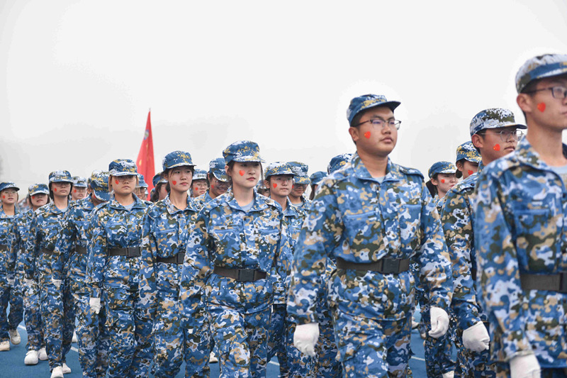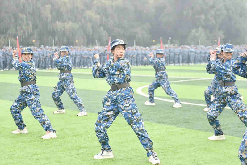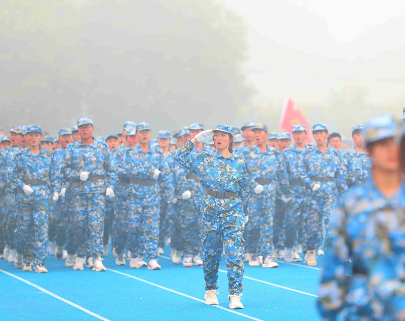 在庄严的升国旗仪式后,受训学生和着雄壮的进行曲,迈着矫健而整齐的步伐,依次走过主席台接受检阅。