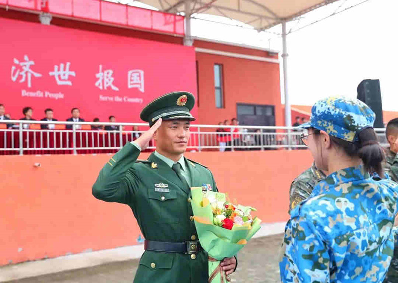 学生代表给军训教官献花。