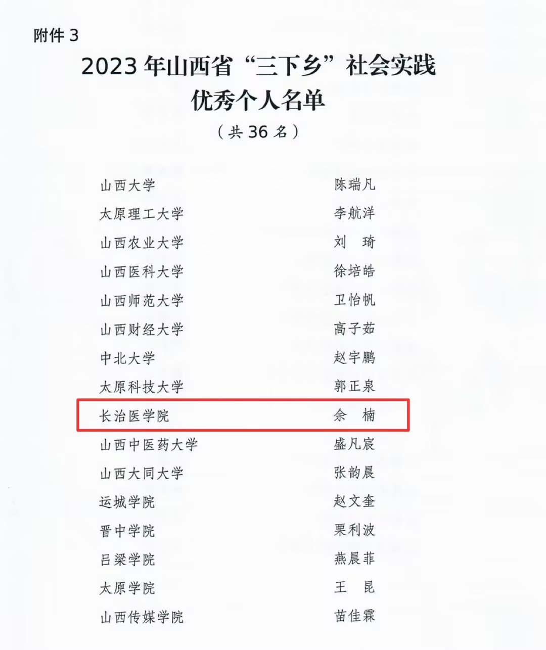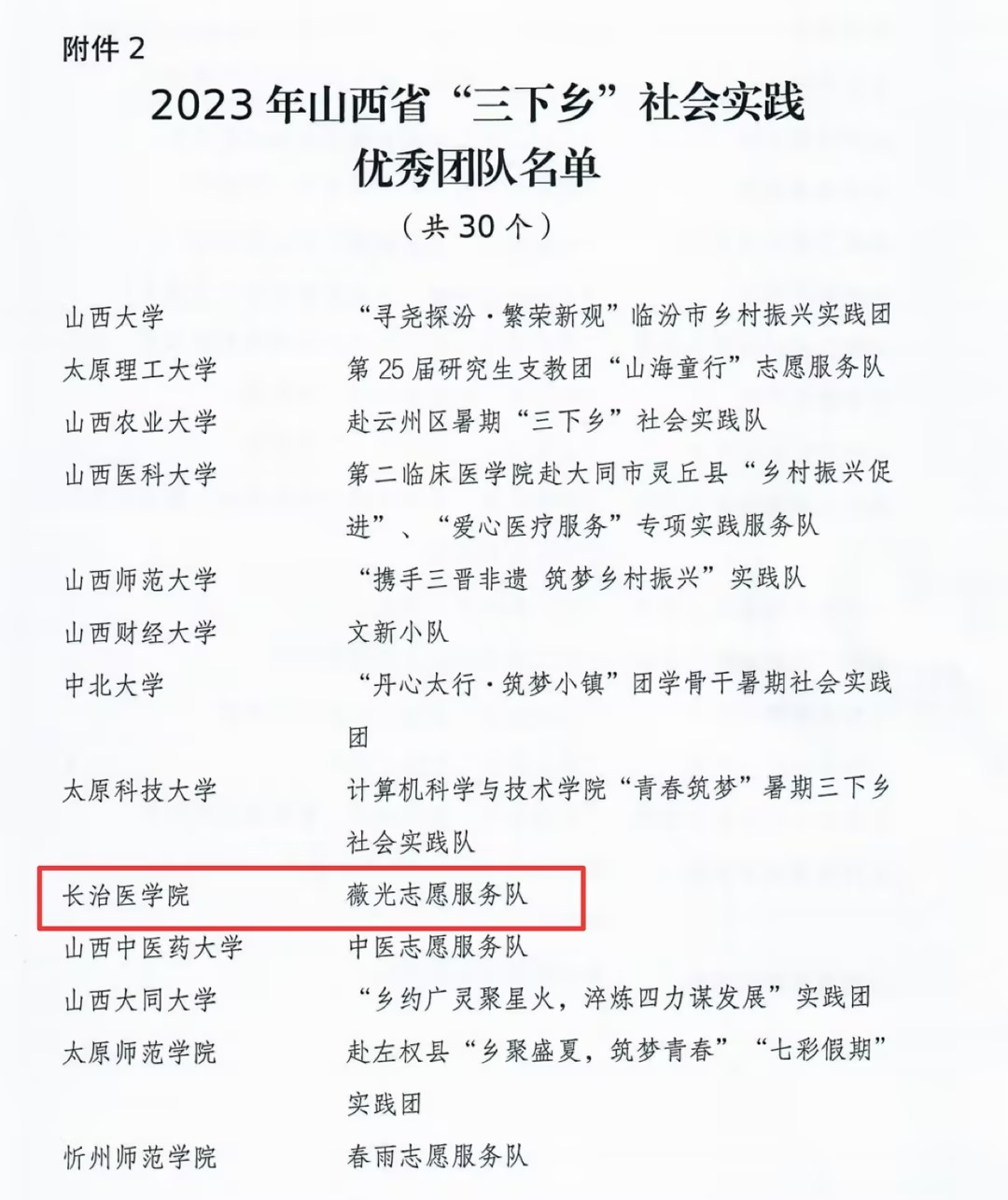 10月18日,共青团山西省委发布了《关于通报表扬2023年山西省“三下乡”社会实践工作中表现突出集体和个人的通知》。我校基础医学部薇光志愿服务再次荣获2023年山西省“三下乡”社会实践优秀团队称号,基础医学部实验2101班余楠荣获2023年山西省“三下乡”社会实践优秀个人称号。