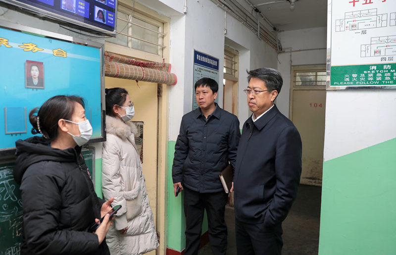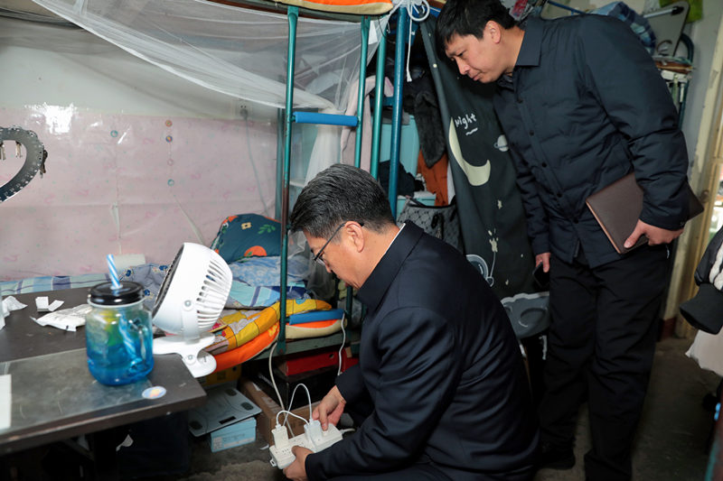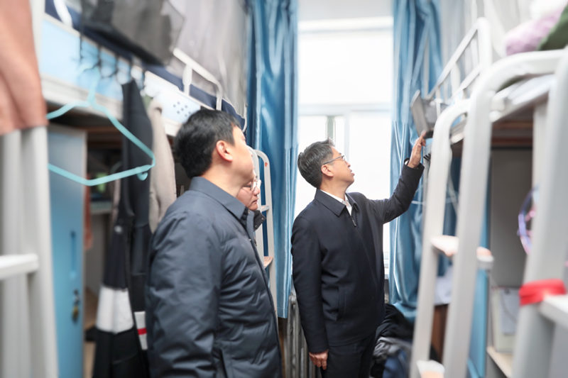 校党委书记李华荣随同检查组深入学生宿舍,聚焦重要部位和重要设施,深挖安全隐患盲区死角,查找薄弱环节和重大风险,现场研判,立整立改。