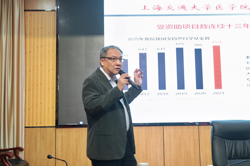 丁健青分享了近年来上海交通大学医学院国家自然科学基金资助情况,并作题为《科研项目申请的一些体会》的讲座。从基金项目分类、申请不予受理原因、课题撰写思路和申请成功要素等四个方面对国家自然科学基金成功申报经验进行了分享,并与在场青年科研人员进行了交流互动。