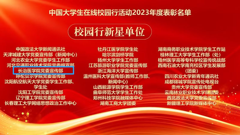 2023年,在党委宣传部的指导下,大学生记者团围绕学校中心工作,凝聚青春奋进力量,在全校范围内举办了记者周活动、考研送祝福等活动,吸引了广大青年学生积极参与,受到了师生一致好评,同时,也提升了中国大学生在线校园行活动在长医学子心中的公信力与影响力。