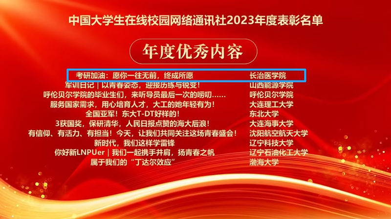 12月14日,中国大学生在线公布了校网通及校园行活动2023年度表彰名单。我校党委宣传部荣获“校园行新星单位”称号,作品《考研加油:愿你一往无前,终成所愿》被评为“年度优秀内容”。