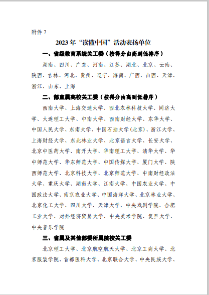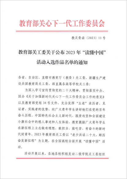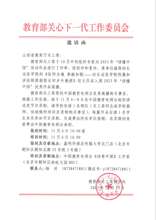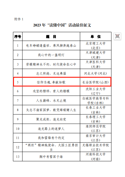 近日,教育部关工委公布了2023年“读懂中国”活动入选作品名单,我校关工委选送的由第二临床学院学生撰写的征文作品《信仰为魂 奉献如歌——访长治医学院附属和济医院原副院长田步升教授》荣获“最佳征文”奖,并入围2023年“读懂中国”活动优秀作品展播。我校关工委荣获教育部2023年“读懂中国”活动表扬单位。