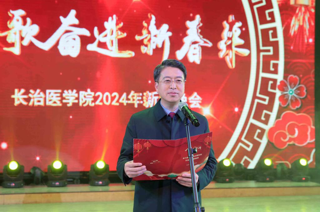 党委书记李华荣发表晚会致辞,代表校党委和行政,向全校师生员工、医疗集团医护人员、全体离退休老同志、广大校友,向多年来关心、支持长治医学院建设与发展的各级领导、各界朋友,致以新年最美好的祝愿;回顾了一年来,长医人接续奋斗强基铸魂、深化改革提质增效、以文化人弦歌永续取得的主要成绩;号召全校师生更加紧密团结在以习近平同志为核心的党中央周围,凝心聚力、开拓奋进,以高质量发展的实际行动和成效,奋力谱写中国式现代化长医实践新篇章,为全面建设社会主义现代化国家、推进中华民族伟大复兴作出新的更大贡献。