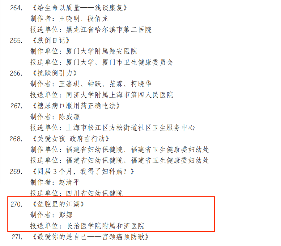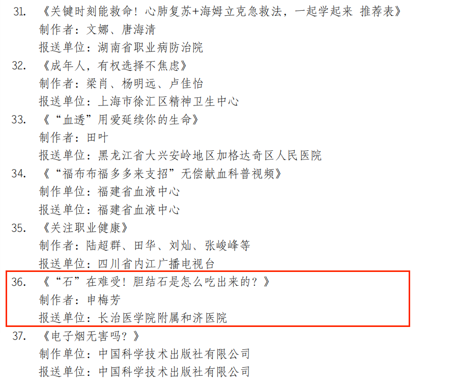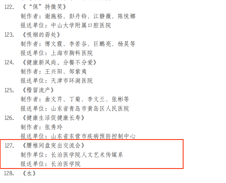 近日,从宣传司《关于公布健康知识普及行动—2023年新时代健康科普作品征集大赛优秀及入围作品名单的通知》中获悉,由我校附属和济医院报送的作品《“石”在难受!胆结石是怎么吃出来的?》《盆腔里的江湖》、人文艺术传媒系报送的作品《腰椎间盘突出交流会》入选“健康知识普及行动—2023年新时代健康科普作品征集大赛”微视频类入围作品名单。