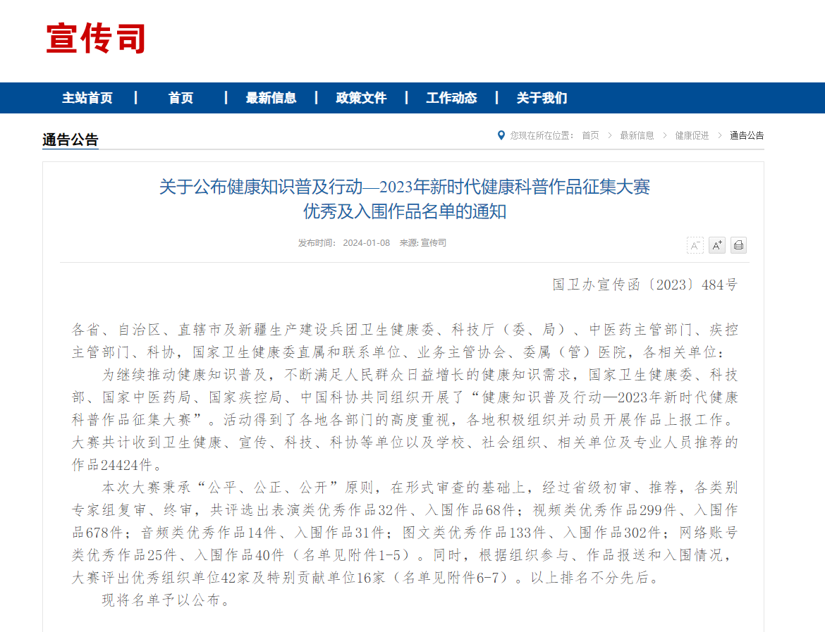 据悉,此项赛事由国家卫生健康委、科技部、国家中医药局、国家疾控局、中国科协共同组织开展,旨在继续推动健康知识普及,不断满足人民群众日益增长的健康知识需求。大赛共计收到卫生健康、宣传、科技、科协等单位以及学校、社会组织、相关单位及专业人员推荐的作品24424件。经过省级初审、推荐,各类别专家组复审、终审,共评选出表演类优秀作品32件、入围作品68件;视频类优秀作品299件、入围作品678件;音频类优秀作品14件、入围作品31件;图文类优秀作品133件、入围作品302件;网络账号类优秀作品25件、入围作品40件;优秀组织单位42家及特别贡献单位16家。