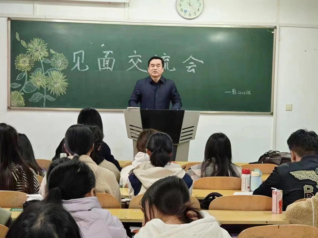 3月11日下午,校党委常委、副校长尚进平在北区33教与联系班级影2102班学生进行近距离交流互动。交流会由辅导员郭颖主持。