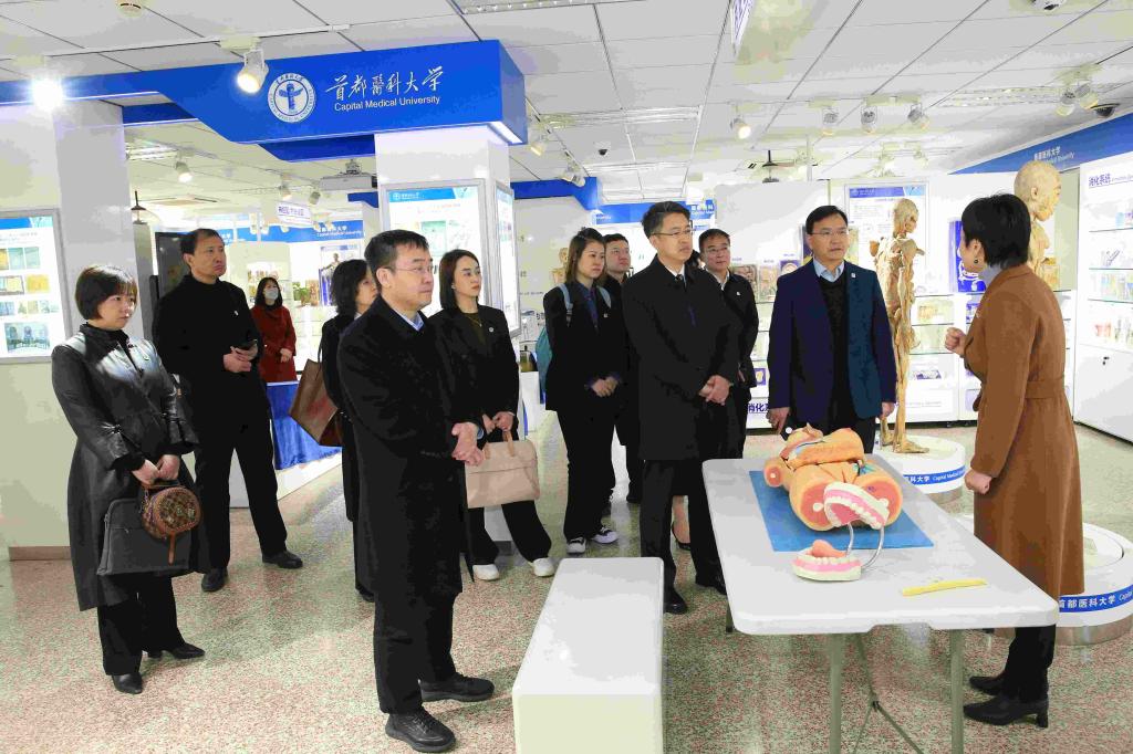 李华荣一行首先参观了首都医科大学建设发展成就展、解剖陈列室和中医药标本馆。在建设发展成就展馆,了解了首都医科大学60余年的发展历史和办学历程,以及该校在教育教学、科学研究、人才培养、社会服务等方面取得的成绩。在形态楼解剖陈列室,详细了解其在学校教育教学、医学研究和科普宣传等方面发挥的重要作用。在中医药标本馆,深入了解了首都医科大学在中医药人才培养、科学研究和教育教学等方面的特色。