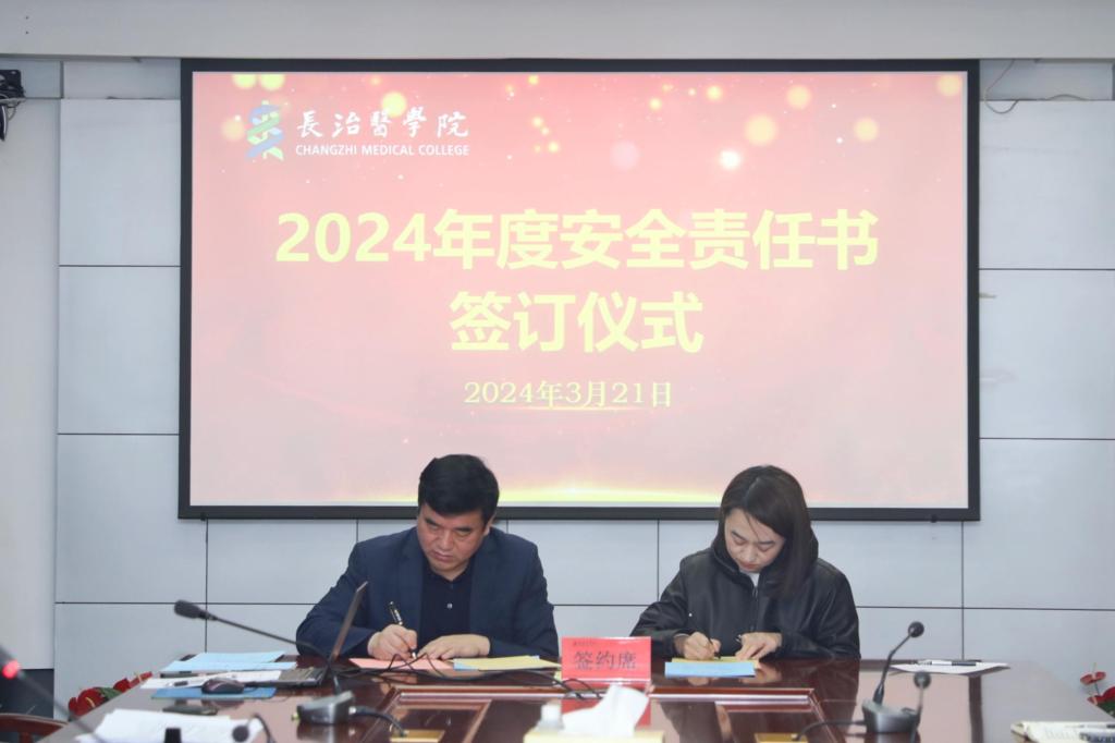 会上,尚进平代表学校和各二级单位(部门)负责人签订了《长治医学院校园社会治安综合治理责任书》《长治医学院消防安全责任书》《长治医学院安全工作目标责任书》。